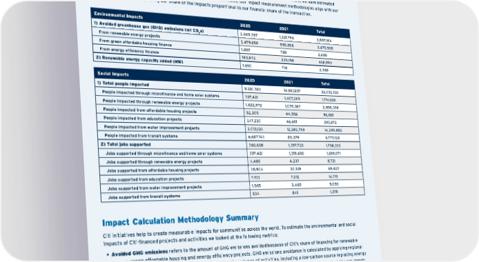 $1 Trillion Sustainable Finance Commitment Impact Data Environmental Impacts 2020 2021 Total 1) Avoided greenhouse gas (GHG) emissions (mt CO 2 e) 2,665,387 1,221,796 3,887,184 From renewable energy projects 2,479,658 995,850 3,475,508 From green affordable housing finance 1,897 789 2,686 From energy efficiency finance 183,832 225,158 408,990 2) Renewable energy capacity added (MW) 1,650 718 2,368 Social Impacts 2020 2021 Total 1) Total people impacted 11,130,783 14,901,937 26,032,720 People impacted through microfinance and home solar systems 307,421 1,407,205 1,714,626 People impacted through renewable energy projects 1,822,972 1,035,387 2,858,359 People impacted from affordable housing projects 52,305 44,556 96,861 People impacted from education projects 247,220 46,651 293,872 People impacted from water improvement projects 2,013,124 12,282,759 14,295,882 People impacted from transit systems 6,687,741 85,379 6,773,120 2) Total jobs supported 360,608 1,397,725 1,758,333 Jobs supported through microfinance and home solar systems 307,421 1,351,650 1,659,071 Jobs supported through renewable energy projects 4,485 4,237 8,721 Jobs supported from affordable housing projects 38,904 30,519 69,423 Jobs supported from education projects 7,701 7,012 14,713 Jobs supported from water improvement projects 1,565 3,465 5,030 Jobs supported from transit systems 534 841 1,375 The reporting on our progress toward our $1 trillion commitment in sustainable finance by 2030 includes measuring the en - vironmental and social impacts associated with contributing sustainable finance projects. Where feasible, we have estimated the impacts representative of Citi’s financing and facilitation activities. Our impact measurement methodologies align with our accounting approach, reporting our share of the impacts proportional to our financial share of the transaction. Impact Calculation Methodology Summary Citi initiatives help to create measurable impacts for communities across the world. To estimate the environmental and social impacts of Citi-financed projects and activities we looked at the following metrics: • Avoided GHG emissions refers to the amount of GHG emissions avoided because of Citi’s share of financing for renewable energy, green affordable housing and energy efficiency projects. GHG emissions avoidance is calculated by applying regional electric grid factors to Citi’s share of financing across three types of activities, including a low-carbon source replacing energy use from the grid, energy efficiency upgrades and green housing units that are LEED-certified. Impacts reflect the per annum benefit as opposed to benefit over entire project life. • For renewable energy projects, total project capacity for energy is calculated as the annual capacity factor applied to the total project size per annum and multiplied by the CO 2 emissions factor. • For energy efficiency upgrades, the average household energy savings is calculated as the average household energy use multiplied by the percentage of energy savings per thousand U.S. dollars invested. The result is multiplied by the total warehouse value and the CO 2 emissions factor. Contents ESGatCiti SustainableFinance SustainableProgress Equitable&ResilientCommunities Talent&DEI RiskManagement&ResponsibleBusiness Appendices CITI 2021 ESG REPORT 28