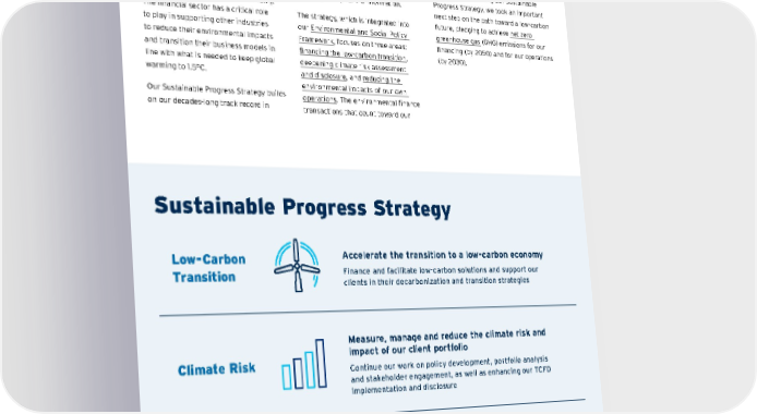 The climate crisis has created not just an opportunity to lead — but an opportunity to partner: working with our clients to decarbonize their businesses as part of our journey to net zero. The science is clear, as is the need to move urgently toward a low-carbon economy. The financial sector has a critical role to play in supporting other industries to reduce their environmental impacts and transition their business models in line with what is needed to keep global warming to 1.5°C. Our Sustainable Progress Strategy builds on our decades-long track record in sustainability and environmental finance. To drive the transition to a low-carbon economy, we are drawing on our expertise, expanding our business unit capabilities and deepening our engagement with the carbon-intensive sectors that are of highest priority for transformation. The s trategy, w hich i s i ntegrated i nto our Environmental a nd S ocial P olicy Framework , f ocuses o n t hree a reas: financing t he l ow-carbon t ransition , deepening c limate r isk a ssessment and d isclosure , a nd reducing t he environmental i mpacts o f o ur o wn operations . T he e nvironmental fi nance transactions t hat c ount t oward o ur $1 tr illion c ommitment t o su stainable finance, w hich a lso i ncludes a c ommitment to s ocial fi nance, i llustrate h ow C iti i s contributing t o t he l ow-carbon t ransition. One y ear a fter s etting o ur S ustainable Progress S trategy, w e t ook a n i mportant next s tep o n t he p ath t oward a l ow-carbon future, p ledging t o a chieve net z ero greenhouse gas (GHG) e missions f or o ur financing ( by 2 050) a nd f or o ur o perations (by 2030). Sustainable Progress Strategy Low-Carbon Transition Accelerate the transition to a low-carbon economy Finance and facilitate low-carbon solutions and support our clients in their decarbonization and transition strategies Climate Risk Measure, manage and reduce the climate risk and impact of our client portfolio Continue our work on policy development, portfolio analysis and stakeholder engagement, as well as enhancing our TCFD implementation and disclosure Sustainable Operations Reduce the environmental footprint of our facilities and strengthen our sustainability culture Minimize the impact of our global operations through operational footprint goals and further integrate sustainable practices across the company Contents ESGatCiti SustainableFinance SustainableProgress Equitable&ResilientCommunities Talent& DEI RiskManagement&ResponsibleBusiness Appendices CITI 2021 ESG REPORT 31