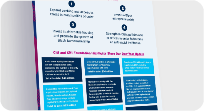Made a new equity investment in First Independence Bank, increasing the number of minority depository institutions (MDIs) Citi has invested in to 11 Total to date: $44 million Commit ted new Citi Impact Fund equity investments in Cityblock Health, Wonderschool, Cayaba Care and seed-stage venture capital firm Precursor Ventures Total to date: $25 million Opportunity LA (OLA) began providing savings accounts to 44,000+ first grade students in the Los Angeles Unified School District using the Citi Start Saving ® platform, becoming the largest universal children’s savings account program in the United States Worked exclusively with five Black-owned firms to syndicate a $2.5 billion bond issuance. Proceeds from the bond will finance quality affordable housing for low-and moderate-income populations in the United States To date, the Citi Foundation has granted $72 million of its three- year target to invest $100 million in community change agents advancing racial equity Expanded reach of the low-cost Citi ® Access Account Package with Local Initiatives Support Corporation (LISC) through their Financial Opportunity Centers in Chicago, Detroit, Houston, Rhode Island and Toledo, Ohio Spent over $1.2 billion with diverse suppliers in 2021, including $432 million with Black-owned businesses alone Closed $16.5 million in affordable housing loan participation opportunities with MDIs Total to date: $36 million Announced plans to eliminate overdraft fees, returned item fees and overdraft protection transfer fees for improved access to banking products and services to aid with addressing racial wealth gaps that have a disproportionately negative impact on Black and Latino customers Action for Racial Equity: An Update on Our Progress Action for Racial Equity Goals Expand banking and access to credit in communities of color Invest in Black entrepreneurship Strengthen Citi’s policies and practices in order to become an anti-racist institution Invest in affordable housing and promote the growth of Black homeownership Citi and Citi Foundation Highlights Since Our One-Year Update 1 2 3 4 Contents ESGatCiti SustainableFinance SustainableProgress Equitable&ResilientCommunities Talent&DEI RiskManagement&ResponsibleBusiness Appendices CITI 2021 ESG REPORT 67