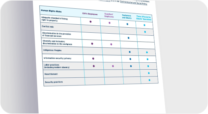 Salient Human Rights Risks: Stakeholder Impacts This table illustrates which stakeholders could be impacted by the human rights risks we have identified as most salient to our company. Rows shaded in gray indicate risks related to the Areas of High Caution defined in our ESRM Policy and trigger additional due diligence for project transactions, general corporate purpose transactions and regular reviews of client relationships. Additional context about our approach to mitigate these risks and related due diligence processes can be found throughout this report, in our Statement on Human Rights and in our Environmental and Social Policy Framework . Human Rights Risks Citi’s Employees Suppliers’ Employees Customers and Clients Those Affected by Clients’ Operations Adequate standard of living; right to property Conflict risk Discrimination in the provision of financial services Diversity and inclusion; discrimination in the workplace Indigenous Peoples Information security; privacy Labor practices (including modern slavery) Resettlement Security practices Contents ESGatCiti SustainableFinance SustainableProgress Equitable&ResilientCommunities Talent&DEI RiskManagement&ResponsibleBusiness Appendices CITI 2021 ESG REPORT 127