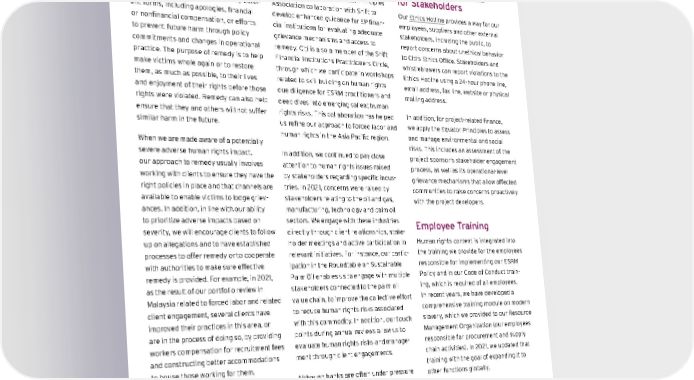 Providing Access to Remedy The UN Guiding Principles call on governments and companies to play their respective roles in ensuring that victims of human rights abuse have access to effec - tive remedy. Remedy can take many differ - ent forms, including apologies, financial or nonfinancial compensation, or efforts to prevent future harm through policy commitments and changes in operational practice. The purpose of remedy is to help make victims whole again or to restore them, as much as possible, to their lives and enjoyment of their rights before those rights were violated. Remedy can also help ensure that they and others will not suffer similar harm in the future. When we are made aware of a potentially severe a dverse hu man r ights im pact, our a pproach t o r emedy u sually i nvolves working w ith c lients t o e nsure t hey h ave t he right policies in place and that channels are available to enable victims to lodge griev - ances. In addition, in line with our ability to p rioritize a dverse im pacts b ased o n severity, we will encourage clients to follow up on allegations and to have established processes to offer remedy or to cooperate with a uthorities t o m ake su re e ffective remedy is provided. For example, in 2021, as t he r esult o f o ur p ortfolio r eview i n Malaysia related to forced labor and related client en gagement, s everal c lients h ave improved their practices in this area, or are in the process of doing so, by providing workers c ompensation f or r ecruitment f ees and c onstructing b etter ac commodations to house those working for them. Learning and Engagement Engaging Stakeholders To ensure that we are living up to our commitment to respect human rights and anticipate emerging risks, we regularly communicate our approach externally, engage with stakeholders on their issues of concern and work to advance respect for human rights more broadly. During 2021, we led an Equator Principles Association collaboration with Shift to develop enhanced guidance for EP finan - cial institutions for evaluating adequate grievance mechanisms and access to remedy. Citi is also a member of the Shift Financial Institutions Practitioners Circle, through which we participate in workshops related to skill building on human rights due diligence for ESRM practitioners and deep dives into emerging salient human rights risks. This collaboration has helped us refine our approach to forced labor and human rights in the Asia Pacific region. In addition, we continued to pay close attention t o h uman r ights i ssues ra ised by s takeholders r egarding s pecific i ndus - tries. I n 2 021, c oncerns w ere ra ised b y stakeholders relating to the oil and gas, manufacturing, technology and palm oil sectors. We engage with these industries directly t hrough c lient r elationships, s take - holder meetings and active participation in relevant initiatives. For instance, our partic - ipation in the Roundtable on Sustainable Palm Oil enables us to engage with multiple stakeholders c onnected t o t he p alm o il value chain, to improve the collective effort to reduce human rights risks associated with this commodity. In addition, our touch points during annual reviews allow us to evaluate human rights risks and manage - ment t hrough c lient en gagements. Although banks are often under pressure to disclose specific findings related to client projects, we are bound by legal requirements related to confidentiality that limit our ability to disclose such infor - mation without client consent. As a result, addressing requests for transparency is a balancing act between protecting the confidentiality of our clients’ information and disclosing information to stakeholders as appropriate to advance the protection of human rights. Reporting Mechanisms for Stakeholders Our Ethics Hotline provides a way for our employees, suppliers and other external stakeholders, including the public, to report concerns about unethical behavior to Citi’s Ethics Office. Stakeholders and whistleblowers can report violations to the Ethics Hotline using a 24-hour phone line, email address, fax line, website or physical mailing a ddress. In addition, for project-related finance, we apply the Equator Principles to assess and manage environmental and social risks. This includes an assessment of the project sponsor’s stakeholder engagement process, as well as its operational-level grievance mechanisms that allow affected communities to raise concerns proactively with the project developers. Employee Training Human rights content is integrated into the training we provide for the employees responsible for implementing our ESRM Policy and in our Code of Conduct train - ing, which is required of all employees. In recent years, we have developed a comprehensive training module on modern slavery, which we provided to our Resource Management Organization (our employees responsible for procurement and supply chain activities). In 2021, we updated that training with the goal of expanding it to other functions globally. Contents ESGatCiti SustainableFinance SustainableProgress Equitable&ResilientCommunities Talent&DEI RiskManagement&ResponsibleBusiness Appendices CITI 2021 ESG REPORT 133