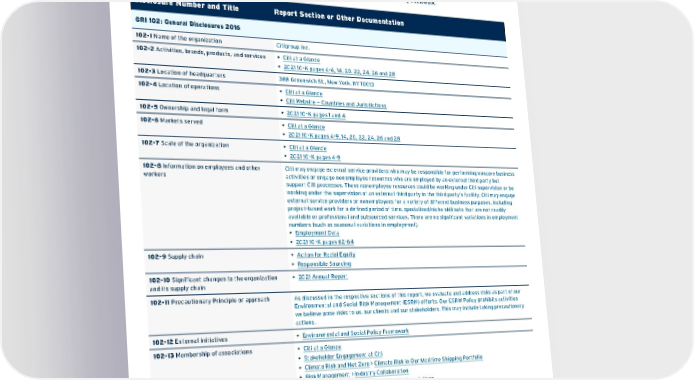GRI Content Index We prepared this report in accordance with the GRI Standards: Core option. We also reported on many disclosures beyond the Core reporting op - tion, including disclosures from the Financial Services Sector Supplement. The following index provides readers with references for where they can find information in this report and other public documents addressing GRI disclosures relevant to our business. All disclosures are reported fully. Please visit the GRI website for the full text of the disclosures and other information on the GRI reporting framework. Disclosure Number and Title Report Section or Other Documentation GRI 102: General Disclosures 2016 102-1 Name of the organization Citigroup Inc. 102-2 Activities, brands, products, and services • Citi at a Glance • 2021 10-K pages 4-6, 14, 20, 22, 24, 26 and 28 102-3 Location of headquarters 388 Greenwich St., New York, NY 10013 102-4 Location of operations • Citi at a Glance • Citi Website — Countries and Jurisdictions 102-5 Ownership and legal form • 2021 10-K pages 1 and 4 102-6 Markets served • Citi at a Glance • 2021 10-K pages 4-9, 14, 20, 22, 24, 26 and 28 102-7 Scale of the organization • Citi at a Glance • 2021 10-K pages 4-9 102-8 Information on employees and other workers Citi may engage external service providers who may be responsible for performing noncore business activities or engage nonemployee resources who are employed by an external third party but support Citi processes. These nonemployee resources could be working under Citi supervision or be working under the supervision of an external third party in the third party’s facility. Citi may engage external service providers or nonemployees for a variety of different business purposes, including project-based work for a defined period of time, specialized/niche skill sets that are not readily available or professional and outsourced services. There are no significant variations in employment numbers (such as seasonal variations in employment). • Employment Data • 2021 10-K pages 62-64 102-9 Supply chain • Action for Racial Equity • Responsible Sourcing 102-10 Significant changes to the organization and its supply chain • 2021 Annual Report 102-11 Precautionary Principle or approach As discussed in the respective sections of this report, we evaluate and address risks as part of our Environmental and Social Risk Management (ESRM) efforts. Our ESRM Policy prohibits activities we believe pose risks to us, our clients and our stakeholders. This may include taking precautionary actions. 102-12 External initiatives • Environmental and Social Policy Framework 102-13 Membership of associations • Citi at a Glance • Stakeholder Engagement at Citi • Climate Risk and Net Zero > Climate Risk in Our Maritime Shipping Portfolio • Risk Management > Industry Collaboration • Citi Political Activities Statement Trade Associations • Environmental and Social Policy Framework 102-14 Statement from senior decision-maker • Letter from Our CEO Contents ESGatCiti SustainableFinance SustainableProgress Equitable&ResilientCommunities Talent&DEI RiskManagement&ResponsibleBusiness Appendices ESGS ataC ius niblnG 139