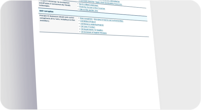 UNGC Principle Report section or other documentation Principle 8: undertake initiatives to promote greater environmental responsibility; and • Our $1 Trillion Commitment • Financing the Low-Carbon Transition • Climate Risk and Net Zero • Sustainable Operations • Responsible Sourcing > Supplier Engagement and Evaluation • Responsible Sourcing > Supply Chain Sustainability Focus Areas Principle 9: encourage the development and diffusion of environmentally friendly technologies. • Our $1 Trillion Commitment • Financing the Low-Carbon Transition • Climate Risk and Net Zero Anti-corruption Principle 10: Businesses should work against corruption in all its forms, including extortion and bribery. • Risk Management > Managing Corruption and Tax-Related Risks • Anti-Bribery Program • Anti-Money Laundering Program • Citi Code of Conduct • Citi Requirements for Suppliers • Citi Statement of Supplier Principles Contents ESGatCiti SustainableFinance SustainableProgress Equitable&ResilientCommunities Talent&DEI RiskManagement&ResponsibleBusiness Appendices ESGS ataC ius niblnG 171