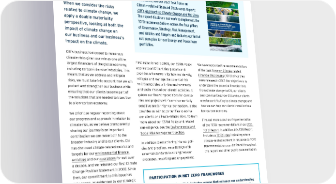 Climate Risk and Net Zero When we consider the risks related to climate change, we apply a double materiality perspective, looking at both the impact of climate change on our business and our business’s impact on the climate. Citi’s business is exposed to numerous climate risks given our role as one of the largest fi nanciers o f t he g lobal ec onomy, including c arbon-intensive in dustries. T his means that as we address and mitigate risks, we must take into account how we will protect and strengthen our business while ensuring t hat o ur c lients b ecome p art o f the s olutions t hat a re needed t o t ransition to a l ow-carbon ec onomy. We prioritize regular reporting about our progress and approach in relation to climate risk, as we believe transparently sharing our journey is an important contribution we can make both to the broader industry and to our clients. Citi has disclosed climate-related metrics and targets f or o ur environmental fi nance activities and our operations for well over a decade, and we released our first Climate Change Position Statement in 2007. Since then, o ur c ommitment t o t his i ssue h as only grown, as evidenced by our strategic approach, a lignment w ith g lobal st an - dards and the continued evolution of our Environmental a nd So cial R isk M anagement (ESRM) Policy in response to the changing risk l andscape. First established in 2003, our ESRM Policy applies t o a ll C iti e ntities g lobally a nd provides a framework for how we identify, mitigate and manage the potential risk to Citi associated with the environmental and social risks of our clients’ activities. It guides o ur fi nancing dec isions f or c ompa - nies a nd p rojects w ithin e nvironmentally sensitive a nd/or h igh-carbon se ctors. It a lso provides us with opportunities to advise our clients on climate-related risks. To learn more about our ESRM Policy and related due d iligence, s ee t he Environmental a nd Social R isk M anagement s ection . In addition to establishing internal poli - cies and practices, we also align with external s tandards t o s trengthen o ur processes, r eporting a nd e ngagement. We h ave s upported t he r ecommendations of t he Task Force on Climate-related Financial D isclosures (TCFD) since they were released in 2017. Our objective is to understand the potential financial risks from climate change to Citi, our clients and communities; how Citi and our clients may b e c ontributing t o c limate c hange; a nd how we can help our clients transition to a low-carbon ec onomy. Find out more about our implementation of t he T CFD r ecommendations i n o ur 2021 TCFD R eport . In addition, this ESG Report includes a TCFD in dex indicating where climate-related content in response to TCFD recommendations can b e f ound t hroughout this report and other public documentation. Our TCFD Report: Citi’s Approach to Climate Change and Net Zero To find more detailed climate-related disclosures, see our 2021 Task Force on Climate-related Financial Disclosures Report: Citi’s Approach to Climate Change and Net Zero . The report discloses our work to implement the TCFD recommendations across the four pillars of Governance, Strategy, Risk Management, and Metrics and Targets and includes our initial net zero plan for our Energy and Power loan portfolios. PARTICIPATION IN NET ZERO FRAMEWORKS Citi is a member of multiple industry groups that enhance our understand ing of — and ability to act on — climate-related issues. These groups include the Partnership for Carbon Accounting Financials (PCAF), the Net-Zero Banking Alliance (NZBA) and the Glasgow Financial Alliance for Net Zero (GFANZ). Learn more about these in our 2021 TCFD Report . Contents ESGatCiti SustainableFinance SustainableProgress Equitable&ResilientCommunities Talent& DEI RiskManagement&ResponsibleBusiness Appendices CITI 2021 ESG REPORT 37