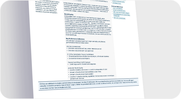 Reporting and Self- Assessment Requirements High-Level Summary of Bank’s Response References 2.3 Plans for Target Implementation and Monitoring Show that your bank has defined actions and milestones to meet the set targets. Show that your bank has put in place the means to measure and monitor progress against the set targets. Definitions of key performance indicators, any changes in these definitions, and any rebasing of baselines should be transparent. Measures and actions we plan to put in place: Climate Change: In early 2022, we released our 2021 TCFD Report, which highlights potential emissions-reduction approaches for our Energy and Power loan portfolios to reach net zero GHG emissions. In the initial net zero plan for these portfolios, we provide a phased timeline of actions and measures to achieve our interim 2030 targets including client transition assessment; advisory and finance; clean tech finance; public policy engagement, risk management; and portfolio management. These areas of activity are detailed further in the report. Racial Equity: In November 2021, we released our Year One Progress report, which summarizes progress made against our Action for Racial Equity commitments to help close the racial wealth gap and expand economic mobility for communities of color in the United States. The report also includes overviews on our approach to working with MDIs, providing venture capital to Black founders, supporting more equitable rental housing, embedding equity in asset management and leveraging philanthropy from the Citi Foundation to support small businesses. In October 2021, we committed to conduct an audit of Action for Racial Equity , which intends to assess the design and implementation of our effort and will help inform how to adapt and grow our work to address the racial wealth gap. Key Performance Indicators: Citi will report progress toward our targets annually using the key performance indicators listed below: Net Zero Commitment: • Emissions associated with key carbon-intensive sectors • Emissions associated with our operations $1 Trillion Sustainable Finance Commitment: • Financial performance broken down by region, criteria and business • Environmental and social impacts Thermal Coal Mining Credit Exposure: • Credit exposure to thermal coal companies Action for Racial Equity: • Growth in banking and access to credit in communities of color • Amount of equity investments in Black-owned firms • Amount of equity investments in MDIs • Growth of consumer lending capabilities that increase access to mortgage products and services 2021 ESG Report: • Sustainable Finance • Climate Risk and Net Zero • Action for Racial Equity • Citi Impact Fund External References: • 2021 TCFD Report • Action for Racial Equity • ARE Year One Progress Report • Environmental and Social Policy Framework • Net Zero Commitment Citi has established strategies and initiatives to implement the identified targets. We have identified key performance indicators that we will report annually to monitor progress toward these targets. While the provided indicators are not an exhaustive list, we anticipate that these metrics may evolve as we move further toward implementation. Contents ESGatCiti SustainableFinance SustainableProgress Equitable&ResilientCommunities Talent&DEI RiskManagement&ResponsibleBusiness Appendices ESGS ataC ius niblnG 161