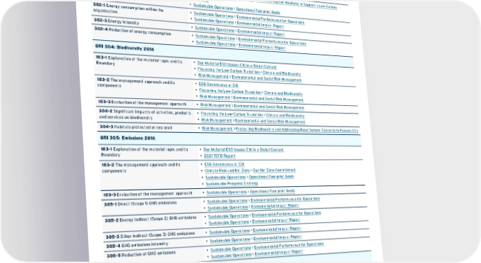 103-2 The management approach and its components • ESG Governance at Citi • Our $1 Trillion Commitment • Financing the Low-Carbon Transition • Climate Risk and Net Zero > Our Net Zero Commitment • Sustainable Operations > Operational Footprint Goals • Sustainable Progress Strategy 103-3 Evaluation of the management approach • Financing the Low-Carbon Transition > Transforming Our Business to Support a Low-Carbon Economy • Sustainable Operations > Operational Footprint Goals 302-1 Energy consumption within the organization • Sustainable Operations > Environmental Performance for Operations • Sustainable Operations > Environmental Impact Report 302-3 Energy intensity • Sustainable Operations > Environmental Impact Report 302-4 Reduction of energy consumption • Sustainable Operations > Environmental Performance for Operations • Sustainable Operations > Environmental Impact Report GRI 304: Biodiversity 2016 103-1 Explanation of the material topic and its Boundary • Our Material ESG Issues: Citi in a Global Context • Financing the Low-Carbon Transition > Climate and Biodiversity • Risk Managemen t > Environmental and Social Risk Management 103-2 The management approach and its components • ESG Governance at Citi • Financing the Low-Carbon Transition > Climate and Biodiversity • Risk Managemen t > Environmental and Social Risk Management 103-3 Evaluation of the management approach • Risk Management > Environmental and Social Risk Management 304-2 Significant impacts of activities, products, and services on biodiversity • Financing the Low-Carbon Transition > Climate and Biodiversity • Risk Management > Environmental and Social Risk Management 304-3 Habitats protected or restored • Risk Management > Protecting Biodiversity and Addressing Resettlement Concerns in Panama Cit y GRI 305: Emissions 2016 103-1 Explanation of the material topic and its Boundary • Our Material ESG Issues: Citi in a Global Context • 2021 TCFD Report 103-2 The management approach and its components • ESG Governance at Citi • Climate Risk and Net Zero > Our Net Zero Commitment • Sustainable Operations > Operational Footprint Goals • Sustainable Progress Strategy 103-3 Evaluation of the management approach • Sustainable Operations > Operational Footprint Goals 305-1 Direct (Scope 1) GHG emissions • Sustainable Operations > Environmental Performance for Operations • Sustainable Operations > Environmental Impact Report 305-2 Energy indirect (Scope 2) GHG emissions • Sustainable Operations > Environmental Performance for Operations • Sustainable Operations > Environmental Impact Report 305-3 Other indirect (Scope 3) GHG emissions • Sustainable Operations > Environmental Impact Report 305-4 GHG emissions intensity • Sustainable Operations > Environmental Impact Report 305-5 Reduction of GHG emissions • Sustainable Operations > Environmental Performance for Operations • Sustainable Operations > Environmental Impact Report GRI 306: Waste 2020 103-1 Explanation of the material topic and its Boundary • Our Material ESG Issues: Citi in a Global Context • Sustainable Operations > Operational Footprint Goals 103-2 The management approach and its components • ESG Governance at Citi • Sustainable Operations > Operational Footprint Goals • Sustainable Progress Strategy 103-3 Evaluation of the management approach • Sustainable Operations > Operational Footprint Goals Contents ESGatCiti SustainableFinance SustainableProgress Equitable&ResilientCommunities Talent&DEI RiskManagement&ResponsibleBusiness Appendices ESGS ataC ius niblnG 144