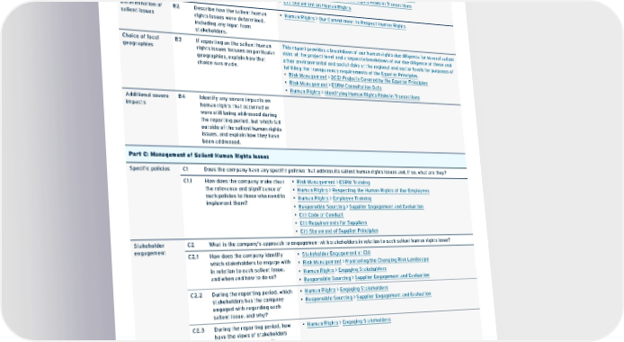 Section of the Framework Report Section or Other Documentation Part B: Defining the Focus of Reporting Statement of salient issues B1 State the salient human rights issues associated with the company’s activities and business relationships during the reporting period. • Human Rights > Our Salient Human Rights Risks • Human Rights > Salient Human Rights Risks: Stakeholder Impacts • Human Rights > Identifying Human Rights Risks in Transactions • Citi Statement on Human Rights Determination of salient issues B2 Describe how the salient human rights issues were determined, including any input from stakeholders. • Human Rights > Our Commitment to Respect Human Rights Choice of focal geographies B3 If reporting on the salient human rights issues focuses on particular geographies, explain how that choice was made. This report provides a breakdown of our human rights due diligence for several salient risks at the project level and a separate breakdown of our due diligence of these and other environmental and social risks at the regional and sector levels for purposes of fulfilling the transparency requirements of the Equator Principles . • Risk Management > 2021 Projects Covered by the Equator Principles • Risk Management > ESRM Consultation Data • Human Rights > Identifying Human Rights Risks in Transactions Additional severe impacts B4 Identify any severe impacts on human rights that occurred or were still being addressed during the reporting period, but which fall outside of the salient human rights issues, and explain how they have been addressed. Part C: Management of Salient Human Rights Issues Specific policies C1 Does the company have any specific policies that address its salient human rights issues and, if so, what are they? C1.1 How does the company make clear the relevance and significance of such policies to those who need to implement them? • Risk Management > ESRM Training • Human Rights > Respecting the Human Rights of Our Employees • Human Rights > Employee Training • Responsible Sourcing > Supplier Engagement and Evaluation • Citi Code of Conduct • Citi Requirements for Suppliers • Citi Statement of Supplier Principles Stakeholder engagement C2 What is the company’s approach to engagement with stakeholders in relation to each salient human rights issue? C2.1 How does the company identify which stakeholders to engage with in relation to each salient issue, and when and how to do so? • Stakeholder Engagement at Citi • Risk Management > Monitoring the Changing Risk Landscape • Human Rights > Engaging Stakeholders • Responsible Sourcing > Supplier Engagement and Evaluation C2.2 During the reporting period, which stakeholders has the company engaged with regarding each salient issue, and why? • Human Rights > Engaging Stakeholders • Responsible Sourcing > Supplier Engagement and Evaluation C2.3 During the reporting period, how have the views of stakeholders influenced the company’s understanding of each salient issue and/or its approach to addressing it? • Human Rights > Engaging Stakeholders Contents ESGatCiti SustainableFinance SustainableProgress Equitable&ResilientCommunities Talent&DEI RiskManagement&ResponsibleBusiness Appendices ESGS ataC ius niblnG 173