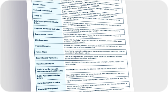 Material Topics Definitions/Relevance to Citi Biodiversity Our role in preventing the decline in the number, genetic variability and variety of species essential to global and bioregional ecosystem resilience through our financing Business Ethics Following our policies, including compliance with laws, anti-corruption and bribery, anti-competitive behavior, paying taxes and transparent political engagement Business Model Resilience Creating, developing and deploying a business model that can meet significant challenges such as natural disasters, health pandemics and global climate change Climate Change Reducing our own contribution to climate change while financing and facilitating projects that accelerate the transition to a low-carbon economy Community Investment Enabling greater cohesion with community stakeholders through public-private partnerships, monetary or in-kind donations, volunteer time or employee fundraising/match schemes COVID-19 Adjusting our operations and long-term strategy to allow us to respond effectively to current and future global health crises Data Security/Financial Product Safety Executing the policies, procedures and programs designed to safeguard the privacy of information shared by employees, customers and clients Employee Health and Well-being Creating workspaces that promote employee wellness, and engaging employees in our effort to maintain a culture of safety, sustainability and wellness Environmental Justice Enacting environmental policies and practices that ensure the fair treatment and involvement of people of all races, national origins and income ESG Governance Aligning with stakeholder interests while protecting the environment, advancing social causes and conducting ourselves responsibly Financial Inclusion Engaging with community banks and low-income stakeholders, and orienting the company’s place in the market to serve underserved communities Human Rights Respecting the basic rights and freedoms of clients, customers, employees, suppliers and Indigenous communities in all our banking activities Innovation and Digitization Problem-solving with clients, partnering with experts and fostering an environment that values experimentation and technological advancements Operational Footprint Reducing direct impacts by managing energy use, water consumption, recycling, waste and green building design Products and Services with Environmental or Social Benefits Providing products and services that drive more equity in society and that protect the environment Public Policy and Regulation Reform Advocating for public policies that support the interests of our company, clients and employees in the countries and regions where we operate Racial Equity/Racial Justice Implementing policies and programs that promote equal opportunity and treatment for people of all races Stakeholder Engagement Actively exchanging input, insights, expertise and perspectives with a wide array of stakeholders as we pursue our sustainability objectives Systemic Risk Management Navigating an evolving risk landscape to make responsible decisions and serve the long-term interests of our clients and the communities in which they operate Talent Attraction, Retention and Development Adopting an approach to recruiting, hiring, developing and retaining employees to create positive working conditions so that our employees can thrive Transparency and Trust Protecting the confidentiality of our clients’ information while disclosing information to stakeholders that demonstrates our accountability and credibility Workforce Diversity, Inclusion and Equal Opportunity Enhancing our efforts to promote equal opportunities for all people, and supporting a culture of diversity, equity and inclusion in the workplace Contents ESGatCiti SustainableFinance SustainableProgress Equitable&ResilientCommunities Talent&DEI RiskManagement&ResponsibleBusiness Appendices CITI 2021 ESG REPORT 15