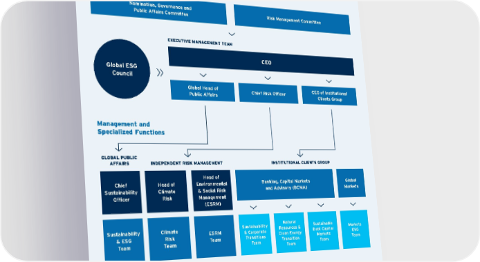 Global ESG Council Climate Risk Steering Group Climate Risk Working Group Net Zero Task Force Global Sustainability Steering Committee Climate Change Governance Board of Directors Steering Groups EXECUTIVE MANAGEMENT TEAM Management and Specialized Functions Nomination, Governance and Public Affairs Committee Risk Management Committee CEO Sustainability & ESG Team Chief Sustainability Officer Head of Climate Risk Head of Environmental & Social Risk Management (ESRM) Banking, Capital Markets and Advisory (BCMA) Global Markets Climate Risk Team ESRM Team Sustainability & Corporate Transitions Team Natural Resources & Clean Energy Transition Team Sustainable Debt Capital Markets Team Markets ESG Team GLOBAL PUBLIC AFFAIRS INSTITUTIONAL CLIENTS GROUP INDEPENDENT RISK MANAGEMENT Global Head of Public Affairs Chief Risk Officer CEO of Institutional Clients Group The following climate change governance diagram illustrates our governance structure as of April 2022. For more about Citi’s governance related to climate risk, see our 2021 TCFD Report . Contents ESGatCiti SustainableFinance SustainableProgress Equitable&ResilientCommunities Talent& DEI RiskManagement&ResponsibleBusiness Appendices CITI 2021 ESG REPORT 43