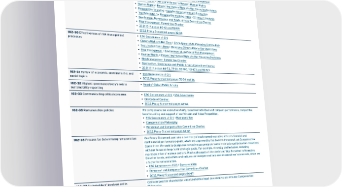 Disclosure Number and Title Report Section or Other Documentation 102-29 Identifying and managing economic, environmental, and social impacts • ESG Governance at Citi • Stakeholder Engagement at Citi • Climate Risk and Net Zero > Citi’s Approach to Managing Climate Risk • Sustainable Operations > Managing Climate Risk in Our Operations • Risk Management > Environmental and Social Risk Management • Human Rights > Our Commitment to Respect Human Rights • Human Rights > Respecting Human Rights in Our Financing Decisions • Responsible Sourcing > Supplier Engagement and Evaluation • The Principles for Responsible Banking Index > 2.1 Impact Analysis • Nomination, Governance and Public Affairs Committee Charter • Risk Management Committee Charter • 2021 10-K pages 60-61 and 118-119 • 2022 Proxy Statement pages 32-34 102-30 Effectiveness of risk management processes • ESG Governance at Citi • Climate Risk and Net Zero > Citi’s Approach to Managing Climate Risk • Sustainable Operations > Managing Climate Risk in Our Operations • Risk Management > Environmental and Social Risk Management • Human Rights > Respecting Human Rights in Our Financing Decisions • Risk Management Committee Charter • Nomination, Governance and Public Affairs Committee Charter • 2021 10-K pages 66-73, 77-81, 92-100, 101-103 and 110-121 102-31 Review of economic, environmental, and social topics • ESG Governance at Citi • 2022 Proxy Statement pages 32-34 and 36 102-32 Highest governance body’s role in sustainability reporting • Head of Global Public Affairs 102-33 Communicating critical concerns • ESG Governance at Citi > ESG Governance • Citi Code of Conduct • 2022 Proxy Statement pages 43-44 102-35 Remuneration policies We compensate our executives fairly, based on individual and company performance, competitive benchmarking and support of our Mission and Value Proposition. • ESG Governance at Citi > Remuneration • Compensation Philosophy • Personnel and Compensation Committee Charter • 2022 Proxy Statement pages 64-67 102-36 Process for determining remuneration Our Proxy Statement contains a summary of each named executive officer’s financial and nonfinancial performance goals, which are approved by the Board’s Personnel and Compensation Committee. We seek to design our executive pay program to motivate balanced behaviors consistent with our focus on long-term strategic goals. For example, diversity and inclusion, including representation of women and U.S. Black colleagues at the Assistant Vice President to Managing Director levels, and ethics and culture are incorporated into senior executives’ scorecards, which are a factor in remuneration. • ESG Governance at Citi > Remuneration • Personnel and Compensation Committee Charter • 2022 Proxy Statement pages 64-67 102-37 Stakeholders’ involvement in remuneration Citi incorporates shareholder and stakeholder input on executive pay into our Compensation Philosophy. • Compensation Philosophy • Personnel and Compensation Committee Charter 102-40 List of stakeholder groups • Stakeholder Engagement at Citi 102-41 Collective bargaining agreements • Human Rights > Respecting the Human Rights of Our Employees 102-42 Identifying and selecting stakeholders • Stakeholder Engagement at Citi • Human Rights > Learning and Engagement Contents ESGatCiti SustainableFinance SustainableProgress Equitable&ResilientCommunities Talent&DEI RiskManagement&ResponsibleBusiness Appendices ESGS ataC ius niblnG 141
