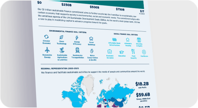 $1 Trillion in Sustainable Finance by 2030 $0 $250B $750B $1T by 2030 $500B $ 222 Billion Sustainable Finance Commitment Progress 2020-2021 Our $1 trillion sustainable finance commitment aims to further accelerate the transition to a sustainable, low- carbon economy that supports society’s environmental, social and economic needs. The commitment aligns with the ambitious agenda of the UN Sustainable Development Goals (SDGs). As the world’s most global bank, Citi has a role to play in mobilizing capital to advance progress toward the goals. We finance and facilitate sustainable activities to support the needs of people and communities around the world. Renewable Energy Sustainable Agriculture & Land Use Sustainable Transportation Water Conservation & Quality Economic Inclusion Education Food Security Healthcare Affordable Basic Infrastructure Affordable Housing Diversity & Equity Energy Efficiency G reen Buildings ENVIRONMENTAL FINANCE GOAL CRITERIA SOCIAL FINANCE GOAL CRITERIA Circular Economy Clean Technology Additional data related to our $1 trillion commitment can be found later in this chapter. $18.2B Asia Pacific $59.6B Europe, Middle East and Africa $9.5B Latin America $134.8B North America REGIONAL REPRESENTATION (2020-2021) World Bank Low-Income and Lower-Middle-Income Countries with Citi Presence Upper Middle-Income Countries with Citi Presence High-Income Countries with Citi Presence Contents ESGatCiti SustainableFinance SustainableProgress Equitable&ResilientCommunities Talent&DEI RiskManagement&ResponsibleBusiness Appendices CITI 2021 ESG REPORT 21