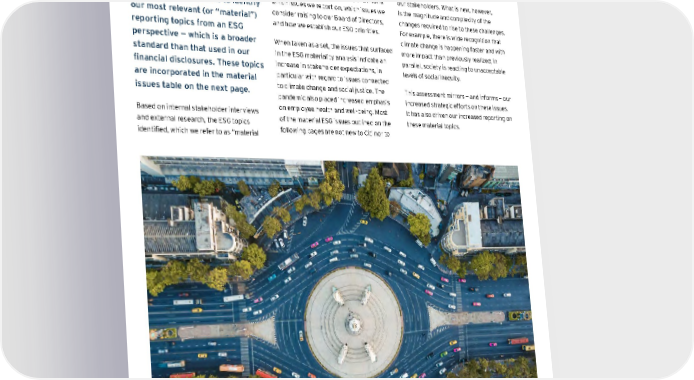 Our Material ESG Issues: Citi in a Global Context In 2020, we conducted a materiality assessment to identify our most relevant (or “material”) reporting topics from an ESG perspective — which is a broader standard than that used in our financial disclosures. These topics are incorporated in the material issues table on the next page. Based o n i nternal s takeholder i nterviews and external research, the ESG topics identified, w hich w e r efer t o a s “m aterial ESG i ssues” t hroughout t his r eport, i nform which i ssues w e r eport o n, w hich i ssues w e consider r aising t o o ur B oard o f D irectors, and how we establish our ESG priorities. When t aken a s a s et, t he i ssues t hat su rfaced in the ESG materiality analysis indicate an increase in s takeholder e xpectations, in particular w ith r egard t o i ssues c onnected to climate change and social justice. The pandemic a lso p laced in creased e mphasis on employee health and well-being. Most of t he m aterial E SG i ssues o utlined o n t he following pages are not new to Citi nor to our stakeholders. What is new, however, is t he m agnitude a nd c omplexity o f t he changes required to rise to these challenges. For example, there is wide recognition that climate change is happening faster and with more i mpact t han p reviously r ealized; i n parallel, s ociety i s r eacting t o u nacceptable levels of social inequity. This assessment mirrors — and informs — our increased st rategic e fforts on t hese i ssues. It h as a lso d riven o ur in creased r eporting o n these ma terial t opics. Contents ESGatCiti SustainableFinance SustainableProgress Equitable&ResilientCommunities Talent&DEI RiskManagement&ResponsibleBusiness Appendices CITI 2021 ESG REPORT 13