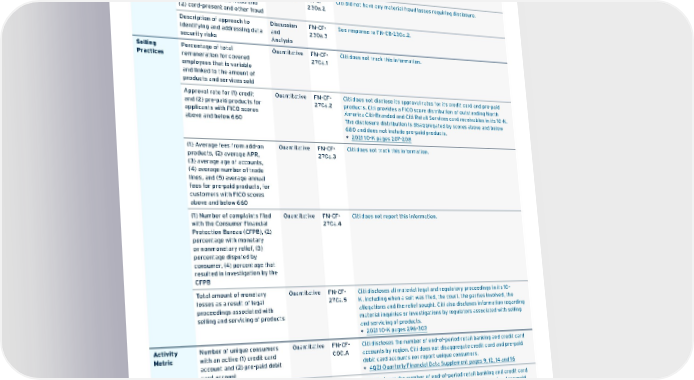 Topic Accounting Metric Category Code Response Data Security (1) Number of data breaches, (2) percentage involving personally identifiable information (PII), (3) number of account holders affected Quantitative FN-CF- 230a.1 See response to FN-CB-230a.1. Card-related fraud losses from (1) card-not-present fraud and (2) card-present and other fraud Quantitative FN-CF- 230a.2 Citi did not have any material fraud losses requiring disclosure. Description of approach to identifying and addressing data security risks Discussion and Analysis FN-CF- 230a.3 See response to FN-CB-230a.2. Selling Practices Percentage of total remuneration for covered employees that is variable and linked to the amount of products and services sold Quantitative FN-CF- 270a.1 Citi does not track this information. Approval rate for (1) credit and (2) pre-paid products for applicants with FICO scores above and below 660 Quantitative FN-CF- 270a.2 Citi does not disclose its approval rates for its credit card and pre-paid products. Citi provides a FICO score distribution of outstanding North America Citi-Branded and Citi Retail Services card receivables in its 10-K. The disclosure distribution is disaggregated by scores above and below 680 and does not include pre-paid products. • 2021 10-K pages 207-208 (1) Average fees from add-on products, (2) average APR, (3) average age of accounts, (4) average number of trade lines, and (5) average annual fees for pre-paid products, for customers with FICO scores above and below 660 Quantitative FN-CF- 270a.3 Citi does not track this information. (1) Number of complaints filed with the Consumer Financial Protection Bureau (CFPB), (2) percentage with monetary or nonmonetary relief, (3) percentage disputed by consumer, (4) percentage that resulted in investigation by the CFPB Quantitative FN-CF- 270a.4 Citi does not report this information. Total amount of monetary losses as a result of legal proceedings associated with selling and servicing of products Quantitative FN-CF- 270a.5 Citi discloses all material legal and regulatory proceedings in its 10- K, including when a suit was filed, the court, the parties involved, the allegations and the relief sought. Citi also discloses information regarding material inquiries or investigations by regulators associated with selling and servicing of products. • 2021 10-K pages 296-303 Activity Metric Number of unique consumers with an active (1) credit card account and (2) pre-paid debit card account Quantitative FN-CF- 000.A Citi discloses the number of end-of-period retail banking and credit card accounts by region. Citi does not disaggregate credit card and pre-paid debit card accounts nor report unique consumers. • 4Q21 Quarterly Financial Data Supplement pages 9, 12, 14 and 16 Number of (1) credit card accounts and (2) pre-paid debit card accounts Quantitative FN-CF- 000.B Citi discloses the number of end-of-period retail banking and credit card accounts by region. Citi does not disaggregate credit card and pre-paid debit card accounts. • 4Q21 Quarterly Financial Data Supplement pages 9, 12, 14 and 16 Contents ESGatCiti SustainableFinance SustainableProgress Equitable&ResilientCommunities Talent&DEI RiskManagement&ResponsibleBusiness Appendices ESGS ataC ius niblnG 152