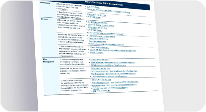 Task Force on Climate-related Financial Disclosures Index The following table indicates where readers can find information that addresses the TCFD requirements, either in this report or other publicly avail - able documents. In addition, see our 2021 TCFD Report , which includes detailed information in response to TCFD requirements. Disclosure Report Section or Other Documentation Governance a) Describe the Board’s oversight of climate-related risks and opportunities. • 2021 TCFD Report • Nomination, Governance and Public Affairs Committee Charter b) Describe management’s role in assessing and managing climate- related risks and opportunities. • Climate Risk and Net Zero • 2021 TCFD Report Strategy a) Describe the climate-related risks and opportunities the organization has identified over the short, medium and long term. • Our $1 Trillion Commitment • Financing the Low-Carbon Transition • Climate Risk and Net Zero • 2021 TCFD Report • Citi’s Environmental and Social Policy Framework b) Describe the impact of climate- related risks and opportunities on the organization’s businesses, strategy and financial planning. • Financing the Low-Carbon Transition • Climate Risk and Net Zero • Sustainable Operations • Citi’s Environmental and Social Policy Framework c) Describe the resilience of the organization’s strategy, taking into consideration different climate- related scenarios, including a 2°C or lower scenario. • Climate Risk and Net Zero • Sustainable Operations > Managing Climate Risk in Our Operations • 2021 TCFD Report Risk Management a) Describe the organization’s processes for identifying and assessing climate-related risks. • Climate Risk and Net Zero • Risk Management > Environmental and Social Risk Management • Citi’s Environmental and Social Policy Framework b) Describe the organization’s processes for managing climate- related risks. • Climate Risk and Net Zero • Sustainable Operations > Managing Climate Risk in Our Operations • Risk Management > Environmental and Social Risk Management • Citi’s Environmental and Social Policy Framework c) Describe how processes for identifying, assessing and managing climate-related risks are integrated into the organization’s overall risk management. • Climate Risk and Net Zero • Sustainable Operations > Managing Climate Risk in Our Operations • Risk Management > Environmental and Social Risk Management • Citi’s Environmental and Social Policy Framework • 2021 10-K pages 118–119 Contents ESGatCiti SustainableFinance SustainableProgress Equitable&ResilientCommunities Talent&DEI RiskManagement&ResponsibleBusiness Appendices ESGS ataC ius niblnG 168