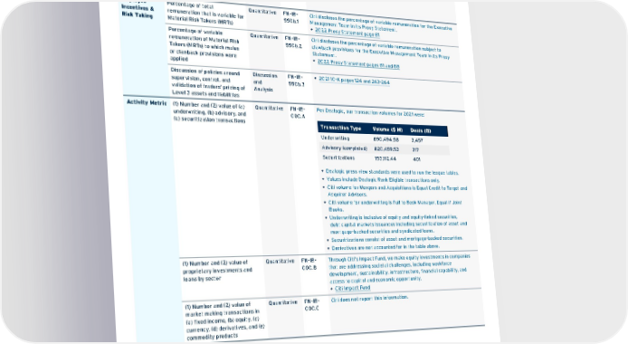 Systemic Risk Management Global Systemically Important Bank (G-SIB) score, by category Quantitative FN-IB- 550a.1 See response to FN-CB-550a.1. Description of approach to incorporation of results of mandatory and voluntary stress tests into capital adequacy planning, long-term corporate strategy, and other business activities Discussion and Analysis FN-IB- 550a.2 See response to FN-CB-550a.2. Employee Incentives & Risk Taking Percentage of total remuneration that is variable for Material Risk Takers (MRTs) Quantitative FN-IB- 550b.1 Citi discloses the percentage of variable remuneration for the Executive Management Team in its Proxy Statement. • 2022 Proxy Statement page 81 Percentage of variable remuneration of Material Risk Takers (MRTs) to which malus or clawback provisions were applied Quantitative FN-IB- 550b.2 Citi discloses the percentage of variable remuneration subject to clawback provisions for the Executive Management Team in its Proxy Statement. • 2022 Proxy Statement pages 81 and 88 Discussion of policies around supervision, control, and validation of traders’ pricing of Level 3 assets and liabilities Discussion and Analysis FN-IB- 550b.3 • 2021 10-K pages 124 and 263-264 Activity Metric (1) Number and (2) value of (a) underwriting, (b) advisory, and (c) securitization transactions Quantitative FN-IB- 000.A Per Dealogic, our transaction volumes for 2021 were: Transaction Type Volume ($ M) Deals (#) Underwriting 890,494.58 3,457 Advisory (completed) 820,459.53 317 Securitizations 153,112.44 401 • Dealogic press view standards were used to run the league tables. • Values include Dealogic Rank Eligible transactions only. • Citi volume for Mergers and Acquisitions is Equal Credit to Target and Acquirer Advisors. • Citi volume for underwriting is Full to Book Manager, Equal if Joint Books. • Underwriting is inclusive of equity and equity-linked securities, debt capital markets issuances including securitization of asset and mortgage-backed securities and syndicated loans. • Securitizations consist of asset and mortgage-backed securities. • Derivatives are not accounted for in the table above. (1) Number and (2) value of proprietary investments and loans by sector Quantitative FN-IB- 000.B Through Citi’s Impact Fund, we make equity investments in companies that are addressing societal challenges, including workforce development, sustainability, infrastructure, financial capability, and access to capital and economic opportunity. • Citi Impact Fund (1) Number and (2) value of market making transactions in (a) fixed income, (b) equity, (c) currency, (d) derivatives, and (e) commodity products Quantitative FN-IB- 000.C Citi does not report this information. Contents ESGatCiti SustainableFinance SustainableProgress Equitable&ResilientCommunities Talent&DEI RiskManagement&ResponsibleBusiness Appendices ESGS ataC ius niblnG 154