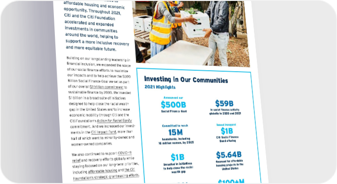 Over the past two years, the COVID-19 pandemic reaffirmed the urgency to address the vast and growing inequities facing our global society, from financial security and access to basic human necessities to affordable housing and economic opportunity. Throughout 2021, Citi and the Citi Foundation accelerated and expanded investments in communities around the world, helping to support a more inclusive recovery and more equitable future. Building on our longstanding leadership in financial inclusion, we expanded the scope of our social finance efforts to maximize our impacts and to help achieve the $500 Billion Social Finance Goal we set as part of our overall $1 trillion commitment to sustainable finance by 2030. We invested $1 billion in a broad suite of initiatives designed to help close the racial wealth gap in the United States and to increase economic mobility through Citi and the Citi F oundation’s Action for Racial Equity commitment. And we increased our invest - ments in the Citi Impact Fund , more than half of which went to minority-owned and women-owned c ompanies. We also continued to support COVID-19 relief and recovery efforts globally while staying f ocused o n o ur l ong-term p riorities, including affordable hou sing and the Citi Foundation’s s trategic g rantmaking e fforts . Investing in Our Communities 2021 Highlights $500B Social Finance Goal Committed to reach 15M households, including 10 million women, by 2025 $59B in social finance activity globally in 2020 and 2021 Issued inaugural $1B Citi Social Finance Bond offering $1B invested in initiatives to help close the racial wealth gap 68% of asset allocation directed to women and/ or racially/ethnically diverse founders of companies through the Citi Impact Fund $5.64B financed for affordable housing projects in the United States $100+M in grants provided by the Citi Foundation Announced our Contents ESGatCiti SustainableFinance SustainableProgress Equitable&ResilientCommunities Talent&DEI RiskManagement&ResponsibleBusiness Appendices CITI 2021 ESG REPORT 61