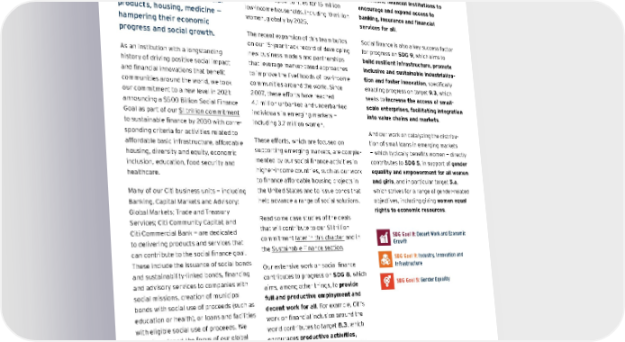 Our Commitment to Social Finance Billions of people around the world lack access to basic necessities — clean water, education, electricity, financial products, housing, medicine — hampering their economic progress and social growth. As an institution with a longstanding history of driving positive social impact and financial innovations that benefit communities around the world, we took our commitment to a new level in 2021: announcing a $500 Billion Social Finance Goal as part of our $1 trillion commitment to sustainable finance by 2030 with corre - sponding criteria for activities related to affordable basic infrastructure, affordable housing, diversity and equity, economic inclusion, education, food security and healthcare. Many of our Citi business units — including Banking, Capital Markets and Advisory; Global Markets; Trade and Treasury Services; Citi Community Capital; and Citi Commercial Bank — are dedicated to delivering products and services that can contribute to the social finance goal. These include the issuance of social bonds and sustainability-linked bonds, financing and advisory services to companies with social missions, creation of municipal bonds with social use of proceeds (such as education or health), or loans and facilities with eligible social use of proceeds. We have broadened the focus of our global Citi Social Finance team, formerly our Inclusive Finance team, which works across Citi businesses globally to develop scalable business platforms and client solutions that enable the bank, our clients and partners to expand financial inclusion, accelerate access to basic services, boost job creation and scale social infrastructure development in emerging markets. As part of our social finance focus, we are aiming to invest in opportunities for 15 million low-income households, including 10 million women, globally by 2025. The recent expansion of this team builds on our 15-year track record of developing new business models and partnerships that leverage market-based approaches to improve the livelihoods of low-income communities around the world. Since 2007, these efforts have reached 4.1 million unbanked and underbanked individuals in emerging markets — including 3.7 million women. These efforts, which are focused on supporting emerging markets, are comple - mented by our social finance activities in higher-income countries, such as our work to finance affordable housing projects in the United States and to issue bonds that help advance a range of social solutions. Read some case studies of the deals that will contribute to our $1 trillion commitment later in this chapter and in the Sustainable Finance section . Our extensive work on social finance contributes to progress on SDG 8 , which aims, among other things, to provide full and productive employment and decent work for all . For example, Citi’s work on financial inclusion around the world contributes to target 8.3 , which encourages productive activities, decent job creation, entrepreneurship, creativity and innovation, and the formalization and growth of micro-, small- and medium-sized enterprises through access to financial services . Our approach also supports target 8.10 , which aims to strengthen the capacity of domestic financial institutions to encourage and expand access to banking, insurance and financial services for all . Social finance is also a key success factor for progress on SDG 9 , which aims to build resilient infrastructure, promote inclusive and sustainable industrializa - tion and foster innovation , specifically enabling progress on target 9.3 , which seeks to increase the access of small- scale enterprises, facilitating integration into value chains and markets . And our work on catalyzing the distribu - tion of small loans in emerging markets — which typically benefits women — directly contributes to SDG 5 , in support of gender equality and empowerment for all women and girls , and in particular target 5.a , which strives for a range of gender-related objectives, including giving women equal rights to economic resources . SDG Goal 8: Decent Work and Economic Growth SDG Goal 9: Industry, Innovation and Infrastructure SDG Goal 5: Gender Equality Contents ESGatCiti SustainableFinance SustainableProgress Equitable&ResilientCommunities Talent&DEI RiskManagement&ResponsibleBusiness Appendices CITI 2021 ESG REPORT 62