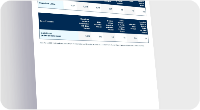 Multiple Identity Breakdowns Table B Race/Ethnicity Total Hispanic or Latino Hispanic/ Latino White Black or African American Native Hawaiian or Pacific Islander Asian American Indian or Alaskan Native Hispanic or Latino 6,214 5,979 5,147 554 55 146 312 Race/Ethnicity Hispanic or Latino in Combination with Other Race(s) White and Other Race(s) Black or African American and Other Race(s) Native Hawaiian or Pacific Islander and Other Race(s) Asian and Other Race(s) American Indian or Alaskan Native and Other Race(s) Multi-Racial (or two or more races) 5,979 562 319 66 318 174 Note: For our EEO-1 U.S. headcount, regulatory logic is applied as specified and enforced by the U.S. Department of Labor’s Equal Employment Opportunity Commission (EEOC). Contents ESGatCiti SustainableFinance SustainableProgress Equitable&ResilientCommunities Talent&DEI RiskManagement&ResponsibleBusiness Appendices CITI 2021 ESG REPORT 102