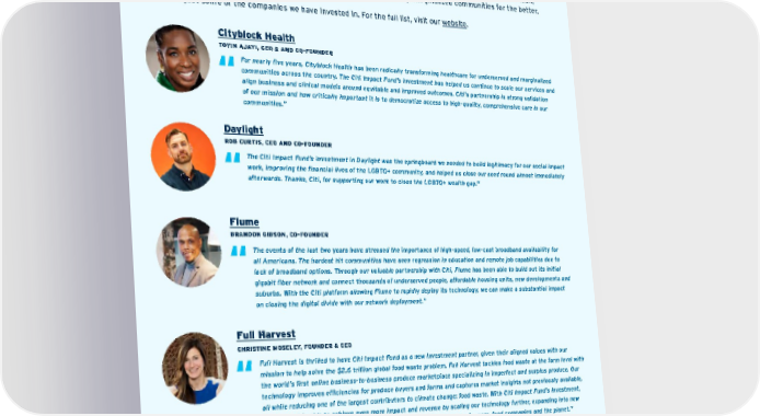 Making an Impact Since its launch in early 2020, the Citi Impact Fund made investments in 31 U.S.-based, double-bottom line companies with business models built around positive social and environmental impact and outcomes. Thirteen of those investments were in companies with Black founders who are working to help close the racial wealth, education, healthcare and connectivity gaps in the United States, directly impacting marginalized communities for the better. Below are just some of the companies we have invested in. For the full list, visit our website . For nearly five years, Cityblock Health has been radically transforming healthcare for underserved and marginalized communities across the country. The Citi Impact Fund’s investment has helped us continue to scale our services and align business and clinical models around equitable and improved outcomes. Citi’s partnership is strong validation of our mission and how critically important it is to democratize access to high-quality, comprehensive care in our communities.” Cityblock Health TOYIN AJAYI, CEO & AND CO-FOUNDER “ The events of the last two years have stressed the importance of high-speed, low-cost broadband availability for all Americans. The hardest hit communities have seen regression in education and remote job capabilities due to lack of broadband options. Through our valuable partnership with Citi, Flume has been able to build out its initial gigabit fiber network and connect thousands of underserved people, affordable housing units, new developments and suburbs. With the Citi platform allowing Flume to rapidly deploy its technology, we can make a substantial impact on closing the digital divide with our network deployment.” Flume BRANDON GIBSON, CO-FOUNDER “ Daylight ROB CURTIS, CEO AND CO-FOUNDER “ The Citi Impact Fund’s investment in Daylight was the springboard we needed to build legitimacy for our social impact work, improving the financial lives of the LGBTQ+ community, and helped us close our seed round almost immediately afterwards. Thanks, Citi, for supporting our work to close the LGBTQ+ wealth gap." Full Harvest CHRISTINE MOSELEY, FOUNDER & CEO Full Harvest is thrilled to have Citi Impact Fund as a new investment partner, given their aligned values with our mission to help solve the $2.6 trillion global food waste problem. Full Harvest tackles food waste at the farm level with the world’s first online business-to-business produce marketplace specializing in imperfect and surplus produce. Our technology improves efficiencies for produce buyers and farms and captures market insights not previously available, all while reducing one of the largest contributors to climate change: food waste. With Citi Impact Fund’s investment, Full Harvest is able to achieve even more impact and revenue by scaling our technology further, expanding into new geographies and commodities and growing our team. A win-win-win for farmers, food companies and the planet.” “ OhmConnect CISCO DEVRIES, CEO Citi is helping fund OhmConnect’s vision to make 100% clean energy accessible to everyone. With our nearly 200,000 California customers saving energy at critical times, we have helped prevent blackouts while paving the way for a more stable grid.” “ Contents ESGatCiti SustainableFinance SustainableProgress Equitable&ResilientCommunities Talent&DEI RiskManagement&ResponsibleBusiness Appendices CITI 2021 ESG REPORT 71