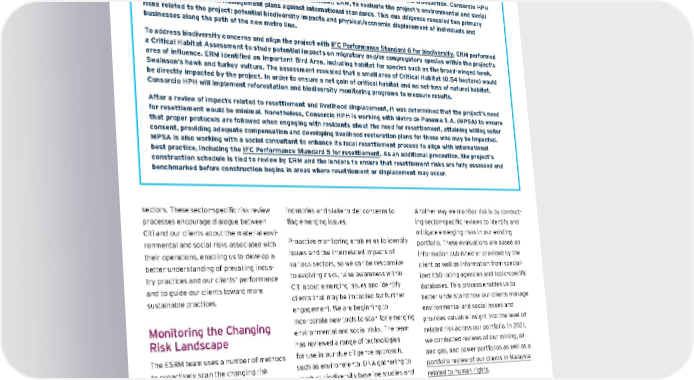 sectors. These sector-specific risk review processes encourage dialogue between Citi a nd o ur c lients a bout t he m aterial e nvi - ronmental and social risks associated with their operations, enabling us to develop a better understanding of prevailing indus - try practices and our clients’ performance and to guide our clients toward more sustainable practices. Monitoring the Changing Risk Landscape The ESRM team uses a number of methods to proactively scan the changing risk landscape for new, emerging risks, as well as risks with increased prominence and prevalence. Through internal research, engagement with our regional ESRM Champions, collaboration with others in our industry, and the use of third-party environmental and social data, we monitor relevant developments in high-risk industries and stakeholder concerns to flag emerging issues. Proactive monitoring enables us to identify issues and the interrelated impacts of various sectors, so we can be responsive to evolving risks, raise awareness within Citi about emerging issues and identify clients that may be impacted for further engagement. We are beginning to incorporate new tools to scan for emerging environmental and social risks. The team has reviewed a range of technologies for use in our due diligence approach, such as environmental DNA gathering to conduct biodiversity baseline studies and benchmark improvements in biodiversity values over time. This technique enables the analysis of DNA in water or soil samples to identify the fauna living in a given project area without the need to visually verify their presence. Another way we monitor risk is by conduct - ing sector-specific reviews to identify and mitigate emerging risks in our existing portfolio. These evaluations are based on information published or provided by the client as well as information from special - ized ESG rating agencies and topic-specific databases. This process enables us to better understand how our clients manage environmental and social issues and provides valuable insight into the level of related risk across our portfolio. In 2021, we conducted reviews of our mining, oil and gas, and power portfolios as well as a portfolio review of our clients in Malaysia related to human rights . PROTECTING BIODIVERSITY AND ADDRESSING RESETTLEMENT CONCERNS IN PANAMA CITY In 2021, Citi, in coordination with other financial institutions, closed a $2 billion transaction to finance Metro Line 3, an expansion of Panama City’s metro system. Citi worked with Consorcio HPH, a consortium of Korean companies responsible for the construction of Metro Line 3. Because this is a project-related corporate loan for more than $50 million, due diligence processes required an independent review before the close of the transaction. Consorcio HPH and the lenders engaged environmental and social consultant, ERM, to evaluate the project’s environmental and social impacts and benchmark management plans against international standards. This due diligence revealed two primary risks related to the project: potential biodiversity impacts and physical/economic displacement of individuals and businesses along the path of the new metro line. To address biodiversity concerns and align the project with IFC Performance Standard 6 for biodiversity , ERM performed a Critical Habitat Assessment to study potential impacts on migratory and/or congregatory species within the project’s area of influence. ERM identified an Important Bird Area, including habitat for species such as the broad-winged hawk, Swainson’s hawk and turkey vulture. The assessment revealed that a small area of Critical Habitat (0.54 hectare) would be directly impacted by the project. In order to ensure a net gain of critical habitat and no net-loss of natural habitat, Consorcio HPH will implement reforestation and biodiversity monitoring programs to measure results. After a review of impacts related to resettlement and livelihood displacement, it was determined that the project’s need for resettlement would be minimal. Nonetheless, Consorcio HPH is working with Metro de Panama S.A. (MPSA) to ensure that proper protocols are followed when engaging with residents about the need for resettlement, attaining willing seller consent, providing adequate compensation and developing livelihood restoration plans for those who may be impacted. MPSA is also working with a social consultant to enhance its local resettlement process to align with international best practice, including the IFC Performance Standard 5 for resettlement . As an additional precaution, the project’s construction schedule is tied to review by ERM and the lenders to ensure that resettlement risks are fully assessed and benchmarked before construction begins in areas where resettlement or displacement may occur. Contents ESGatCiti SustainableFinance SustainableProgress Equitable&ResilientCommunities Talent&DEI RiskManagement&ResponsibleBusiness Appendices CITI 2021 ESG REPORT 117