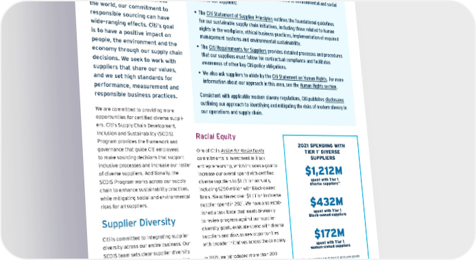 Responsible Sourcing As a global firm that engages with thousands of suppliers across the world, our commitment to responsible sourcing can have wide-ranging effects. Citi’s goal is to have a positive impact on people, the environment and the economy through our supply chain decisions. We seek to work with suppliers that share our values, and we set high standards for performance, measurement and responsible business practices. We are committed to providing more opportunities for certified diverse suppli - ers. Citi’s Supply Chain Development, Inclusion and Sustainability (SCDIS) Program provides the framework and governance that guide Citi employees to make sourcing decisions that support inclusive processes and increase our roster of diverse suppliers. Additionally, the SCDIS Program works across our supply chain to enhance sustainability practices, while mitigating social and environmental risks for all suppliers. Supplier Diversity Citi is committed to integrating supplier diversity across our entire business. Our SCDIS team sets clear supplier diversity goals and embeds them in our sourcing processes. Every bid over $250,000 requires the consideration of diverse firms. Promoting the inclusion of diverse suppli - ers in the bidding process helps us to build a supplier base that more fully represents the communities we serve. Racial Equity One o f C iti’s Action for Racial Equity commitments is investment in Black entrepreneurship, which includes a goal to increase our overall spend with certified diverse s uppliers t o $ 1 b illion a nnually, including $ 250 m illion w ith B lack-owned firms. We achieved over $1 billion in diverse supplier s pend i n 2 021. W e h ave a lso e stab - lished a task force that meets bi-weekly to r eview p rogress a gainst o ur su pplier diversity g oals, e valuate s pend w ith di verse suppliers a nd d iscuss n ew o pportunities with b roader i nitiatives ac ross t he c ompany. In 2 021, w e i ntroduced m ore t han 2 00 diverse su ppliers, w ho h ave e xpertise i n information t echnology s taffing, l earning and d evelopment, c ustomer e xperience, neurodiversity, c areer en try, a nd a dvertising and marketing, to Citi business leaders. Supplier Policies Citi has detailed standards and policies, which guide responsible sourcing initiatives and communicate our expectations related to environmental and social issues to our suppliers: • The Citi Statement of Supplier Principles outlines the foundational guidelines for our sustainable supply chain initiatives, including those related to human rights in the workplace, ethical business practices, implementation of required management systems and environmental sustainability. • The Citi Requirements for Suppliers provides detailed processes and procedures that our suppliers must follow for contractual compliance and facilitates awareness of other key Citi policy obligations. • We also ask suppliers to abide by the Citi Statement on Human Rights . For more information about our approach in this area, see the Human Rights section . Consistent with applicable modern slavery regulations, Citi publishes disclosures outlining our approach to identifying and mitigating the risks of modern slavery in our operations and supply chain. 2021 SPENDING WITH TIER 1 * DIVERSE SUPPLIERS $1,212M spent with Tier 1 diverse suppliers ** $432M spent with Tier 1 Black-owned suppliers $172M spent with Tier 1 women-owned suppliers * Tier 1 suppliers are those Citi procures goods and services from directly. ** This includes spend with many types of diverse suppliers, including Black-owned and women-owned fi rms. Contents ESGatCiti SustainableFinance SustainableProgress Equitable&ResilientCommunities Talent&DEI RiskManagement&ResponsibleBusiness Appendices CITI 2021 ESG REPORT 134