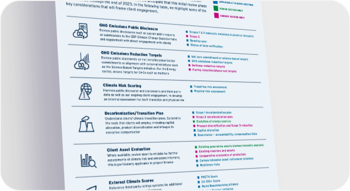 Considerations for Loan Portfolio Assessments Energy and Power Sectors GHG Emissions Public Disclosure Review public disclosures such as sustainability reports or submissions to the CDP Climate Change Questionnaire and supplement with direct engagement with clients GHG Emissions Reduction Targets Review public statements on net zero/decarbonization commitments or alignment with external initiatives such as the Science Based Targets initiative. For the Energy sector, assess targets for GHGs such as methane Decarbonization/Transition Plan Understand clients’ climate transition plans. Determine the tools that clients will employ, including capital allocation, product diversification and linkages to executive compensation Climate Risk Scoring Harness public discourse and statements and third-party data as well as our ongoing client engagement, to develop an internal assessment for both transition and physical risk Client Asset Evaluation Where available, review asset-level data for further assessments of climate risk and emissions intensity; this is particularly applicable to project finance External Climate Scores Reference third-party ratings systems for additional data on climate-related performance Other Data Consider the social elements of transition, including human rights risks, access to energy for developing countries, livelihoods of communities and workers in these sectors and the relevant regulatory environment Scopes 1 & 2 (absolute emissions & physical intensity) Scope 3 Baseline year Status of data verification Net zero commitment or science-based targets GHG emissions reduction targets Methane reduction targets Flaring reduction/phase-out targets Scope 1 decarbonization plan Scope 2 decarbonization plan Evolution of energy sources Product diversification and Scope 3 reduction Capital allocation Governance — accountability, compensation links Transition risk assessment Physical risk assessment Existing generation assets (carbon intensity analysis) Existing reserves and assets Comparative economics of production Carbon-intensive asset retirement schedule Resilience risks PACTA Score CA 100+ Score World Benchmarking Alliance Carbon Tracker Initiative Transition Pathways Initiative Sustainable development factors Country/regional regulatory environment The first step of our net zero plan involves engagement, client by client, to understand each client’s GHG emissions disclosure and their perspective and plans for transition. Additionally, we will review public disclosures, climate governance and the commit - ments and actions they have taken to date. We anticipate that this initial review phase will continue through the end of 2023. In the following table, we highlight some of the key considerations that will frame client engagement. APPLICABLE TO BOTH SECTORS POWER SECTOR ONLY ENERGY SECTOR ONLY Contents ESGatCiti SustainableFinance SustainableProgress Equitable&ResilientCommunities Talent& DEI RiskManagement&ResponsibleBusiness Appendices CITI 2021 ESG REPORT 39