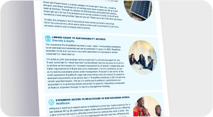 LINKING LOANS TO SUSTAINABILITY METRICS Diversity & Equity The investment firm BlackRock has been a vocal leader in encouraging companies to set and meet environmental and social sustainability goals. In 2021, BlackRock amended its $4.4 billion revolving credit agreement to incorporate certain sustainability-linked metrics. Citi acted as joint lead arranger and co-sustainability structuring agent for the 5-year sustainability-linked loan that ties BlackRock’s borrowing costs to its ability to achieve certain targets for increased representation of women in leadership and higher representation of Black and Latinx employees in its U.S. workforce, as well as increasing sustainable assets under management. Pursuant to the terms of the credit agreement, BlackRock’s applicable borrowing costs are subject to upward or downward adjustments on an annual basis if BlackRock achieves, or fails to achieve, certain specified targets. The facility reinforces BlackRock’s commitment and accountability to achieving certain sustainability goals by integrating a component of financial alignment through its liquidity management strategy. EXPANDING ACCESS TO RELIABLE ENERGY IN KENYA Renewable Energy and Affordable Basic Infrastructure Off-grid solar home systems are a v ital way to expand access to reliable energy. Citi was the sole coordinator on a $75 million transaction to expand access to off-grid solar energy in Kenya. The financing will support Greenlight Planet’s ambitions to reach an additional 10 million households in low-income, off-grid communities over the next five years. Greenlight Planet Kenya is a group company of Greenlight Planet Inc., a leading designer, distributor and financier of rooftop solar home systems for off-grid and weak-grid homes. Through its network of 200 branches and 8,000 field agents, Greenlight sells its Sun King-branded solar energy systems directly to its off-grid residential clients and provides “pay-as-you-go” financing to facilitate their purchase. To date, the company’s Sun King products have saved customers more than $4 billion cumulatively, which would otherwise be used to purchase CO 2 -emitting kerosene lanterns and to charge mobile phones. EXPANDING ACCESS TO HEALTHCARE IN SUB-SAHARAN AFRICA Healthcare mPharma is working to expand access to healthcare across low-income communities in sub-Saharan Africa. By optimizing supply chains and increasing efficiencies, mPharma is able to bring high-quality, affordable medicines to communities most in need — the so-called “last mile” of distribution for pharmaceuticals and vaccines. mPharma also provides financing solutions for mom-and-pop pharmacies, clinics and patients in underserved areas such as Ghana, Nigeria, Zambia and Kenya. Thanks to a line of credit from Citi under Scaling Enterprise, a partnership with the U.S. DFC and the Ford Foundation, mPharma will be able to serve more than 2 million patients in the countries where it operates. Health clinics that operate with mPharma report a decrease of up to 25% in medical-related complications. Contents ESGatCiti SustainableFinance SustainableProgress Equitable&ResilientCommunities Talent&DEI RiskManagement&ResponsibleBusiness Appendices CITI 2021 ESG REPORT 24