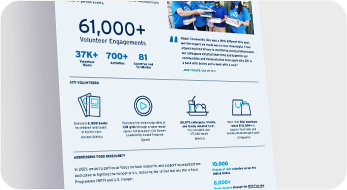 Every year, Citi colleagues, alumni, partners, clients, family and friends come together to participate in Global Community Day, our annual flagship volunteer initiative to give back in the communities where we live and work. For the second year in a row, we adapted in 2021 to find new ways of volunteering in lieu of in-person events. CITI VOLUNTEERS ADDRESSING FOOD INSECURITY 61,000+ Volunteer Engagements 37K+ Volunteer Hours 95,000+ Meals, food boxes and canned goods packed and delivered by colleagues Donated 2,500 books to children and teens in foster care (United States) Fostered the leadership skills of 138 girls through a tailor-made Junior Achievement Citi Women Leadership Award Program (Spain) 20,873 colleagues, friends, and family donated funds that provided over 177,000 meals (Mexico) More than 900 donations raised $112,000+ to support financially and socially disadvantaged youth (Singapore) 700+ Activities 81 Countries and Territories 10,000 Pounds of food collected across the United States 8,000+ Meals donated through the WFP Freerice trivia game 1,800 Boxes of food given through U.S. Hunger Pack With a Purpose 5,000+ Colleagues donated to hunger relief organizations In 2021, we put a particular focus on food insecurity and supporting organizations dedicated to fighting the hunger crisis, including the United Nations World Food Programme (WFP) and U.S. Hunger. Global Community Day was a little different this year, but the impact we made was no less meaningful. From organizing food drives to mentoring young professionals, our colleagues donated their time and talent to our communities and demonstrated once again why Citi is a bank with brains and a bank with a soul.” JANE FRASER, CEO OF CITI “ Global Community Day Contents ESGatCiti SustainableFinance SustainableProgress Equitable&ResilientCommunities Talent&DEI RiskManagement&ResponsibleBusiness Appendices CITI 2021 ESG REPORT 73