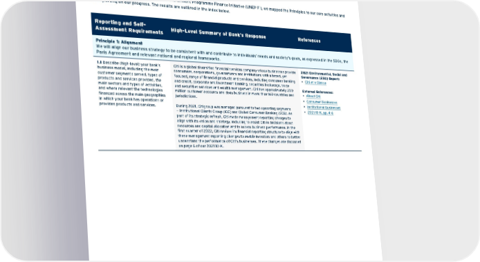 Reporting and Self- Assessment Requirements High-Level Summary of Bank’s Response References Principle 1: Alignment We will align our business strategy to be consistent with and contribute to individuals’ needs and society’s goals, as expressed in the SDGs, the Paris Agreement and relevant national and regional frameworks. 1.1 Describe (high-level) your bank’s business model, including the main customer segments served, types of products and services provided, the main sectors and types of activities, and where relevant the technologies financed across the main geographies in which your bank has operations or provides products and services. Citi is a global diversified financial services company whose businesses provide consumers, corporations, governments and institutions with a broad, yet focused, range of financial products and services, including consumer banking and credit, corporate and investment banking, securities brokerage, trade and securities services and wealth management. Citi has approximately 200 million customer accounts and does business in more than 160 countries and jurisdictions. During 2021, Citigroup was managed pursuant to two operating segments — Institutional Clients Group (ICG) and Global Consumer Banking (GCB). As part of its strategic refresh, Citi made management reporting changes to align with its vision and strategy, including to assist Citi in decisions about resources and capital allocation and to assess business performance. In the first quarter of 2022, Citi revised its financial reporting structure to align with these management reporting changes to enable investors and others to better understand the performance of Citi’s businesses. These changes are discussed on page 6 of our 2021 10-K. 2021 Environmental, Social and Governance (ESG) Report: • Citi at a Glance External References: • About Citi • Consumer Businesses • Institutional Businesses • 2021 10-K, pp. 4-6 The Principles for Responsible Banking Index The Principles for Responsible Banking (PRB) are a framework for ensuring that signatory banks’ strategy and practice align with Sustainable Development Goals (SDGs) and the Paris Climate Agreement (Paris Agreement). The Principles encourage a sustainable banking system and help the industry demonstrate how it makes a positive contribution to society. They embed sustainability at the strategic, portfolio and transactional levels and across all business areas. Following the guidance provided by UN Environment Programme Finance Initiative (UNEP FI), we mapped the Principles to our core activities and are reporting on our progress. The results are outlined in the index below. Contents ESGatCiti SustainableFinance SustainableProgress Equitable&ResilientCommunities Talent&DEI RiskManagement&ResponsibleBusiness Appendices ESGS ataC ius niblnG 155