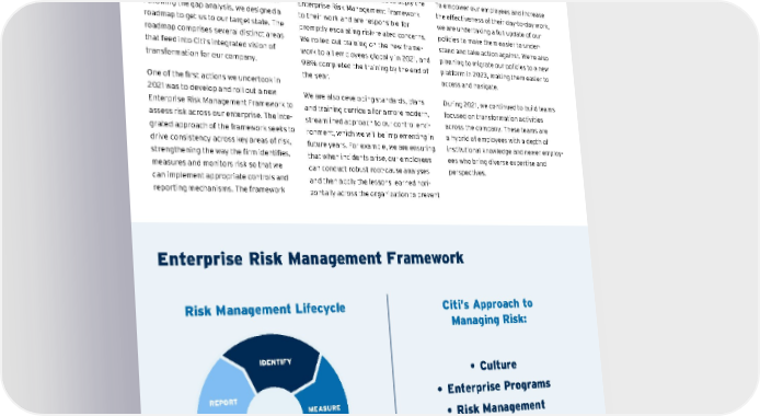 Our Path to Transformation To e stablish a b aseline f or o ur t ransforma - tion s trategy, w e c onducted a g ap a nalysis exercise, s tarted i n 2 020 a nd c ompleted in 2 021, t o r eview t he i ssues r aised i n t he consent o rders a nd d efine t he g ap b etween where w e w ere a nd w here w e n eed t o b e. Following t he g ap a nalysis, w e d esigned a roadmap t o g et u s t o o ur t arget s tate. T he roadmap c omprises s everal d istinct a reas that f eed i nto C iti’s i ntegrated v ision o f transformation f or o ur c ompany. One o f t he fi rst a ctions w e u ndertook i n 2021 w as t o d evelop a nd r oll o ut a n ew Enterprise R isk M anagement F ramework t o assess risk across our enterprise. The inte - grated a pproach o f t he f ramework s eeks t o drive c onsistency a cross k ey a reas o f r isk, strengthening t he w ay t he fi rm i dentifies, measures a nd m onitors r isk s o t hat w e can i mplement a ppropriate c ontrols a nd reporting m echanisms. T he f ramework helps b ring c onsistency a nd s tructure t o the v aried t ypes o f r isks w e f ace a cross Citi — l eading t o b etter s cenario-planning, stress t esting a nd r oot-cause a nalyses across t he r isk l ifecycle. All c olleagues a re e mpowered t o a pply t he Enterprise R isk M anagement F ramework to t heir w ork a nd a re r esponsible f or promptly e scalating r isk-related c oncerns. We r olled o ut t raining o n t he n ew f rame - work t o a ll e mployees g lobally i n 2 021, a nd 98% c ompleted t he t raining b y t he e nd o f the y ear. We a re a lso d eveloping s tandards, p lans and t raining c urricula f or a m ore m odern, streamlined a pproach t o o ur c ontrol e nvi - ronment, w hich w e w ill b e i mplementing i n future y ears. F or e xample, w e a re e nsuring that w hen i ncidents a rise, o ur e mployees can c onduct r obust r oot-cause a nalyses and then apply the lessons learned hori - zontally a cross t he o rganization t o p revent similar i ssues f rom a rising e lsewhere. In a ddition, w e a re w orking t o s implify, streamline a nd a utomate o ur c ontrols — strengthening o ur a bility t o p revent i ssues, not j ust t o d etect t hem a fter t hey a rise. To e mpower o ur e mployees a nd i ncrease the e ffectiveness o f t heir d ay-to-day w ork, we a re u ndertaking a fu ll u pdate o f o ur policies to make them easier to under - stand a nd t ake a ction a gainst. W e’re a lso planning t o m igrate o ur p olicies t o a n ew platform i n 2 023, m aking t hem e asier t o access a nd n avigate. During 2021, we continued to build teams focused on transformation activities across the company. These teams are a hybrid of employees with a depth of institutional knowledge and newer employ - ees who bring diverse expertise and perspectives. Enterprise Risk Management Framework Risk Management Lifecycle Citi’s Approach to Managing Risk: • Culture • Enterprise Programs • Risk Management • Governance TALENT | TECHNOLOGY AND DATA | ANALYTICS MONITOR CONTROL REPORT IDENTIFY MEASURE Contents ESGatCiti SustainableFinance SustainableProgress Equitable&ResilientCommunities Talent&DEI RiskManagement&ResponsibleBusiness Appendices CITI 2021 ESG REPORT 105