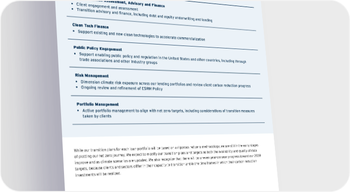 While our transition plans for each loan portfolio will be based on a rigorous net zero methodology, we are still in the early stages of plotting our net zero journey. We expect to modify our transition plans and targets as both the availability and quality of data improve and as climate scenarios are updated. We also recognize that there will be uneven year-on-year progress toward our 2030 targets, because clients and sectors differ in their capacity to transition and in the time frames in which their carbon reduction investments will be realized. Achieving Our Targets We will use a variety of approaches, many of which will run concurrently, to reach our financed emissions reduction targets for our Energy and Power loan portfolios. For further detail on these five areas of activity, refer to our 2021 TCFD Report . Client Transition Assessment, Advisory and Finance • Client engagement and assessment • Transition advisory and finance, including debt and equity underwriting and lending • Support existing and new clean technologies to accelerate commercialization • Support enabling public policy and regulation in the United States and other countries, including through trade associations and other industry groups • Dimension climate risk exposure across our lending portfolios and review client carbon reduction progress • Ongoing review and refinement of ESRM Policy • Active portfolio management to align with net zero targets, including considerations of transition measures taken by clients Clean Tech Finance Public Policy Engagement Risk Management Portfolio Management Contents ESGatCiti SustainableFinance SustainableProgress Equitable&ResilientCommunities Talent& DEI RiskManagement&ResponsibleBusiness Appendices CITI 2021 ESG REPORT 40
