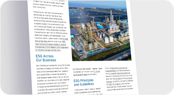 Net zero involves rethinking our business and helping our clients rethink theirs. We can have the biggest impact by reducing Scope 3 financed emissions, 1 particularly for carbon-intensive sectors such as Agriculture, Aluminum, Cement, Coal, Commercial Real Estate, Iron and Steel, Oil and Gas, Power Generation and Transport. To reach our net zero target, we will need to work closely with our clients on their own transitions. Following our net zero announcement, we formed an internal Net Zero Task Force to help determine a framework, scope and the methodologies to guide our progress toward this commitment. For our Energy and Power loan portfolios, we conducted an initial assessment of base - line emissions, set interim 2030 emissions reduction targets, and developed initial transition plans. Learn more in the Climate Risk & Net Zero section and in our 2021 Task Force on Climate-related Financial Disclosures (TCFD) Report: Citi’s Approach to Climate Change and Net Zero . ESG Across Our Business Our ESG focus is essential to our firm-wide business strategy, and many of our busi - ness units have expanded their capacity and capabilities to serve the growing ESG-related needs of our clients. Across the firm, our business units are prepared to support and work with our clients through sustainable finance, providing a variety of products and services with environmental and/or social themes. We h ave E SG s pecialists i n B anking, C apital Markets and Advisory; Global Markets; Treasury and Trade Solutions; and Citi Global Wealth. We have expanded our global Social Finance specialist group and formed new teams to engage with clients on ESG goals and targets. Together, these businesses contribute to our $1 trillion sustainable fin ance commitment. ESG Principles and Guidelines In response to the increasing need for clients to see how we are addressing ESG — and in step with global best prac - tices — we have aligned our reporting with the frameworks and guidance of the Global Reporting Initiative and UN G uiding Principles Reporting Framework . We are also using three relevant sector standards from the Sustainability A ccounting Standards B oard , and we’re addressing the Principles for Responsible Banking . We also include examples of our work that align with the UN SDGs and the UN Global Compact . In addition, we recently released our 2021 TCFD Report , which further illustrates how climate-related risks and opportunities are central to our business. 1. Financed emissions are the GHG emissions generated by the operations and entities that financial institutions lend money to or invest in. Contents ESGatCiti SustainableFinance SustainableProgress Equitable&ResilientCommunities Talent&DEI RiskManagement&ResponsibleBusiness Appendices CITI 2021 ESG REPORT 9