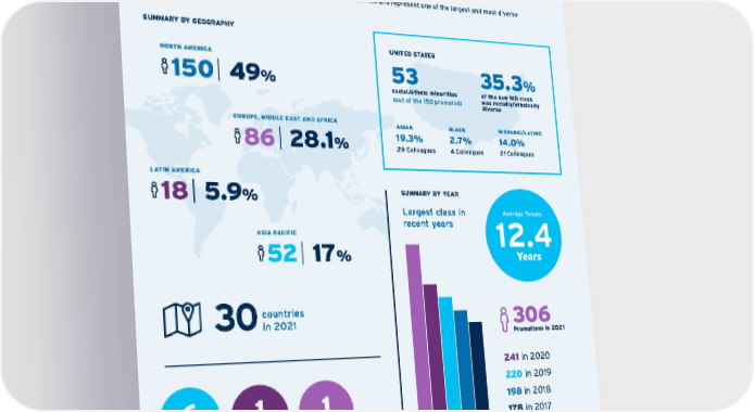 2021 Managing Director Diversity Citi promotes a new class of Managing Directors (MD) each year. This is the highest officer level at Citi and is a testament to these individuals’ performance and commitment to living our Leadership Principles —Taking Ownership, Delivering With Pride and Succeeding Together — and instilling them throughout their teams and the entire firm. For our 2021 class, we promoted 306 MDs, who are based in 30 countries and represent one of the largest and most diverse classes in recent years. SUMMARY BY GEOGRAPHY SUMMARY BY YEAR The most women promoted in recent years Highest representation in recent years 106 in 2021 1 Veteran 36 % 70 in 2020 62 in 2019 49 in 2018 49 in 2017 241 in 2020 220 in 2019 198 in 2018 178 in 2017 30 countries in 2021 6 LGBTQ+ UNITED STATES 53 racial/ethnic minorities (out of the 150 promoted) 35.3 % of the new MD class was ra cially/ethnically diverse 19.3% 29 Colleagues ASIAN 2.7% 4 Colleagues BLACK 14.0% 21 Colleagues HISPANIC/LATINO Largest class in recent years Average Tenure 12.4 Years 306 Promotions in 2021 52 17 % ASIA PACIFIC 18 5.9 % LATIN AMERICA 86 28.1 % EUROPE, MIDDLE EAST AND AFRICA 150 49 % NORTH AMERICA 1 Person with a disability Contents ESGatCiti SustainableFinance SustainableProgress Equitable&ResilientCommunities Talent&DEI RiskManagement&ResponsibleBusiness Appendices CITI 2021 ESG REPORT 89