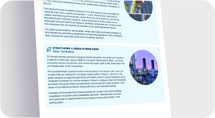 STRUCTURING A GREEN HYBRID BOND Clean Technology Citi helpe d German chemicals company Evonik Industries, one of the world leaders in specialty chemicals, issue a € 500 million green hybrid bond in 2021 — acting as sole green structuring advisor, joint structuring agent, joint global coordinator and joint bookrunner on the transaction. The corporate hybrid bond structure can be attractive to issuers, particularly in Europe, that are looking for a stronger credit profile or financial flexibility. The green issuance followed the publication of Evonik’s Green Finance Framework, which integrates sustainability into the company’s financial strategy. Under the framework, proceeds from green financing instruments may be used for eligible projects in the areas of eco-efficient products, energy efficiency and renewable energy. Proceeds of this green hybrid bond issuance will primarily be used to finance investments in Evonik’s Next Generation Solutions — products and solutions with sustainability benefits that Evonik expects to grow significantly in the coming years. FINANCING RENEWABLE ENERGY WHILE INCREASING DIVERSITY Renewable Energy and Diversity & Equity In November, C iti provided AES’ Clean Energy business, a leading renewables development platform in the United States, with financing to fund the construction and operation of the Skipjack Solar Project outside Richmond, Virginia. The project is expected to provide 225 megawatts-DC (175 megawatts-AC) of renewable energy capacity; once online, the project will sell 100% of its solar energy output under a 14-year, fixed-price agreement to one of the largest power generator companies in the U.S. The transaction also included a milestone: Citi’s first execution of a sustainability- linked derivative for a construction project — a KPI-linked interest rate swap to support the financing of the project. Under the terms, AES commits to achieving key performance indicators linked to increasing gender diversity measured by employees who self-identify as female or nonbinary employees and increasing new hire employees who self-identify as members of an underrepresented group. Citi acted as coordinating lead arranger, lender, and swap syndication arranger on this transaction, providing a comprehensive financing package for AES, a company that is focused on accelerating the future of energy, together. Contents ESGatCiti SustainableFinance SustainableProgress Equitable&ResilientCommunities Talent&DEI RiskManagement&ResponsibleBusiness Appendices CITI 2021 ESG REPORT 26