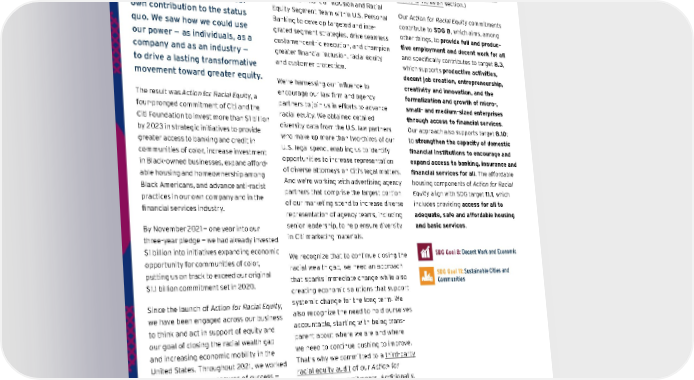 Action for Racial Equity In the midst of a global pandemic that disproportionately affected communities of color, we took a hard look at ourselves and our own contribution to the status quo. We saw how we could use our power — as individuals, as a company and as an industry — to drive a lasting transformative movement toward greater equity. The r esult w as Action for Racial Equity , a four-pronged c ommitment o f C iti a nd t he Citi Foundation to invest more than $1 billion by 2 023 i n s trategic i nitiatives t o p rovide greater access to banking and credit in communities o f c olor, in crease in vestment in B lack-owned bu sinesses, e xpand a fford - able hou sing an d ho meownership am ong Black A mericans, an d a dvance an ti-racist practices i n o ur o wn c ompany a nd i n t he financial s ervices i ndustry. By November 2021 — one year into our three-year pledge — we had already invested $1 billion into initiatives expanding economic opportunity f or c ommunities o f c olor, putting u s o n t rack t o e xceed o ur o riginal $1.1 billion commitment set in 2020. Since t he l aunch o f Action for Racial Equity , we h ave b een e ngaged a cross o ur b usiness to t hink a nd a ct i n su pport o f e quity a nd our g oal o f c losing t he ra cial w ealth g ap and i ncreasing e conomic m obility i n t he United States. Throughout 2021, we worked on o ne o f o ur k ey m easures o f su ccess — institutionalizing t he c ommitment t o ra cial equity a cross t he fi rm. F or e xample, w e created t he D iverse F inancial I nstitutions Group, a d edicated t eam w ithin C iti t hat i s serving a s a h ub t o l ead a nd e xpand fi rm - wide e ngagement w ith m inority d epository institutions ( MDIs), di verse b roker-dealers and d iverse as set m anagers. W e’re a lso diversifying o ur t eams t o b etter s erve our c ommunities. W e s tarted t o d evelop a centralized F inancial I nclusion a nd R acial Equity S egment T eam w ithin U .S. Per sonal Banking t o d evelop t argeted a nd i nte - grated s egment s trategies, d rive s eamless customer-centric e xecution, a nd c hampion greater fi nancial i nclusion, ra cial e quity and c ustomer p rotection. We’re h arnessing o ur i nfluence t o encourage o ur l aw fi rm a nd a gency partners t o j oin u s i n e fforts t o a dvance racial eq uity. W e ob tained de tailed diversity d ata f rom t he U .S. l aw p artners who m ake u p m ore t han t wo-thirds o f o ur U.S. l egal s pend, e nabling u s t o i dentify opportunities t o i ncrease re presentation of d iverse a ttorneys o n C iti’s l egal m atters. And w e’re w orking w ith a dvertising a gency partners t hat c omprise t he l argest p ortion of o ur m arketing s pend t o in crease d iverse representation o f a gency t eams, i ncluding senior l eadership, t o h elp e nsure d iversity in C iti m arketing m aterials. We r ecognize t hat t o c ontinue c losing t he racial w ealth g ap, w e n eed a n a pproach that s parks i mmediate c hange w hile a lso creating e conomic s olutions t hat su pport systemic c hange f or t he l ong t erm. W e also r ecognize t he n eed t o h old o urselves accountable, s tarting w ith b eing t rans - parent a bout w here w e a re a nd w here we n eed t o c ontinue p ushing t o i mprove. That’s w hy w e c ommitted t o a third-party racial e quity a udit o f o ur Action for Racial Equity c ommitments. A dditionally, we w ere t he fi rst m ajor W all S treet bank t o p articipate i n t he M anagement Leadership f or T omorrow B lack E quity at W ork C ertification, w hich w as c reated to h elp g uide c ompanies a nd k eep t hem accountable f or m aking p rogress ar ound Black e quity. ( Learn m ore a bout t he certification i n t he Talent a nd D iversity , Equity & Inclusion s ection.) Our Action for Racial Equity commitments contribute to SDG 8 , which aims, among other things, to provide full and produc - tive employment and decent work for all and specifically contributes to target 8.3 , which supports productive activities, decent job creation, entrepreneurship, creativity and innovation, and the formalization and growth of micro-, small- and medium-sized enterprises through access to financial services . Our approach also supports target 8.10 : to strengthen the capacity of domestic financial institutions to encourage and expand access to banking, insurance and financial services for all . The affordable housing components of Action for Racial Equity align with SDG target 11.1 , which includes providing access for all to adequate, safe and affordable housing and basic services . SDG Goal 8: Decent Work and Economic SDG Goal 11: Sustainable Cities and Communities Contents ESGatCiti SustainableFinance SustainableProgress Equitable&ResilientCommunities Talent&DEI RiskManagement&ResponsibleBusiness Appendices CITI 2021 ESG REPORT 66