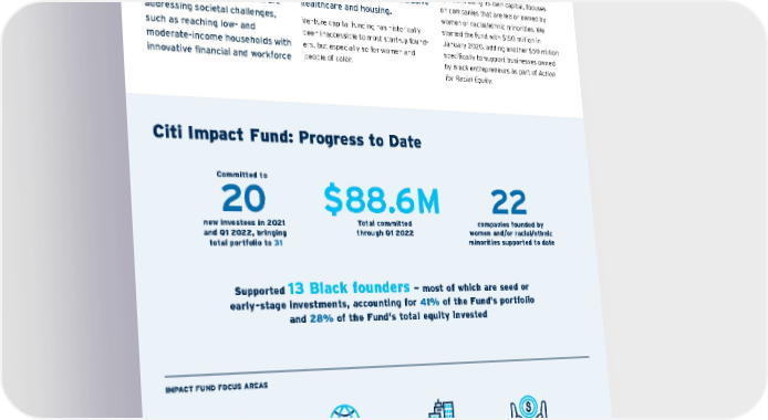 Citi Impact Fund The Citi Impact Fund is a $200 million venture capital fund with a mission of investing in “double bottom line” companies that are addressing societal challenges, such as reaching low- and moderate-income households with innovative financial and workforce services, delivering solutions for the climate transition economy, and addressing needs for inclusive healthcare and housing. Venture capital funding has historically been inaccessible to most start-up found - ers, but especially so for women and people of color. The fund, which at its founding in 2020 was the largest impact fund ever launched by a bank using its own capital, focuses on companies that are led or owned by women or racial/ethnic minorities. We started the fund with $150 million in January 2020, adding another $50 million specifically to support businesses owned by Black entrepreneurs as part of Action for Racial Equity . Committed to 20 new investees in 2021 and Q1 2022, bringing total portfolio to 31 IMPACT FUND FOCUS AREAS $88.6M Total committed through Q1 2022 22 companies founded by women and/or racial/ethnic minorities supported to date Workforce Development Sustainability Physical and Social Infrastructure Financial Inclusion Citi Impact Fund: Progress to Date Supported 13 Black founders — most of which are seed or early-stage investments, accounting for 41% of the Fund’s portfolio and 28% of the Fund’s total equity invested Contents ESGatCiti SustainableFinance SustainableProgress Equitable&ResilientCommunities Talent&DEI RiskManagement&ResponsibleBusiness Appendices CITI 2021 ESG REPORT 70