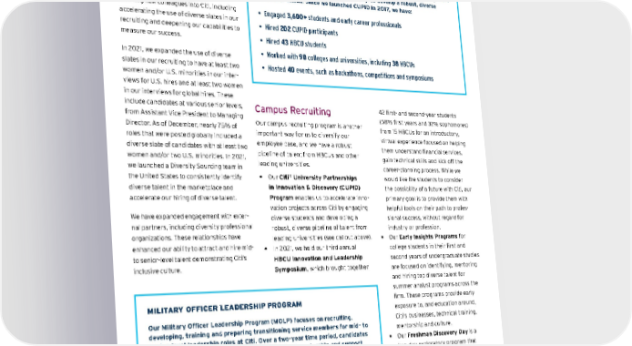 Recruit, Retain and Promote We are committed to continue building a team that is inclusive and representative of our customers and clients. To make progress, we have been evolving the way we bring new colleagues into Citi, including accelerating the use of diverse slates in our recruiting and deepening our capabilities to measure o ur su ccess. In 2021, we expanded the use of diverse slates in our recruiting to have at least two women and/or U.S. minorities in our inter - views for U.S. hires and at least two women in our interviews for global hires. These include candidates at various senior levels, from Assistant Vice President to Managing Director. As of December, nearly 75% of roles that were posted globally included a diverse slate of candidates with at least two women and/or two U.S. minorities. In 2021, we launched a Diversity Sourcing team in the United States to consistently identify diverse talent in the marketplace and accelerate our hiring of diverse talent. We have expanded engagement with exter - nal p artners, i ncluding di versity p rofessional organizations. T hese r elationships h ave enhanced our ability to attract and hire mid- to s enior-level t alent de monstrating C iti’s inclusive cu lture. Campus Recruiting Our campus recruiting program is another important way for us to diversify our employee base, and we have a robust pipeline of talent from HBCUs and other leading universities. • Our Citi ® University Partnerships in Innovation & Discovery (CUPID) Program enables us to accelerate inno - vation projects across Citi by engaging diverse students and developing a robust, diverse pipeline of talent from leading universities (see callout above). • In 2021, we held our third annual HBCU Innovation and Leadership Symposium , which brought together 42 first- and second-year students (58% first years and 32% sophomores) from 15 HBCUs for an introductory, virtual experience focused on helping them understand financial services, gain technical skills and kick off the career-planning process. While we would like the students to consider the possibility of a future with Citi, our primary goal is to provide them with helpful tools on their path to profes - sional success, without regard for industry or profession. • Our Early Insights Programs for college students in their first and second years of undergraduate studies are focused on identifying, mentoring and hiring top diverse talent for summer analyst programs across the firm. These programs provide early exposure to, and education around, Citi’s businesses, technical training, mentorship and culture. • Our Freshman Discovery Day is a two-day exploratory program that helps educate underrepresented minority college freshmen about the various roles in financial services. MILITARY OFFICER LEADERSHIP PROGRAM Our Military Officer Leadership Program (MOLP) focuses on recruiting, developing, training and preparing transitioning service members for mid- to senior-level leadership roles at Citi. Over a two-year time period, candidates rotate three times, giving them a peer network of mentorship and support and a path to a successful career at Citi. “As a former combat veteran, with no direct experience in the financial industry, the MOLP was a great opportu - nity,” said Rob Carter, a graduate of the program who has been with Citi for about five years. “The exposure to different businesses allowed me to find an area within the firm that leveraged the skills I developed during my time in the Army,” says Carter, Senior Vice President in Human Resources and one of the more than 2,400 U.S. employees who have disclosed their veteran status to us. CUPID BY THE NUMBERS The Citi ® University Partnerships in Innovation & Discovery (CUPID) Program embeds students from top universities in innovation activities across Citi. CUPID students — many of them underrepresented minorities — gain exposure to various aspects of our business and help us develop a robust, diverse pipeline of talent. Since we launched CUPID in 2017, we have: • Engaged 3,600+ students and early career professionals • Hired 202 CUPID participants • Hired 43 HBCU students • Worked with 90 colleges and universities, including 38 HBCUs • Hosted 40 events, such as hackathons, competitions and symposiums Contents ESGatCiti SustainableFinance SustainableProgress Equitable&ResilientCommunities Talent&DEI RiskManagement&ResponsibleBusiness Appendices CITI 2021 ESG REPORT 86