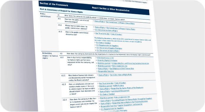 United Nations Guiding Principles Reporting Framework Index We have included information and disclosures in this report aligned with the United Nations Guiding Principles reporting framework. This reflects our support of the UN Guiding Principles on Business and Human Rights and our commitment to transparency and accountability regarding our hu - man rights-related activities and policies. The following table indicates where readers can find information that addresses the framework require - ments, either in this report or other publicly available documents. Section of the Framework Report Section or Other Documentation Part A: Governance of Respect for Human Rights Policy commitment A1 What does the company say publicly about its commitment to respect human rights? A1.1 How has the public commitment been developed? • Human Rights > Our Commitment to Respect Human Rights A1.2 Whose human rights does the public commitment address? • Human Rights > Our Commitment to Respect Human Rights • Citi Statement on Human Rights A1.3 How is the public commitment disseminated? • Our Transformation > Code of Conduct The following documents, which state Citi’s commitment to respect human rights and our expectations about the commitment of others, are posted publicly: • Citi Code of Conduct • Citi Requirements for Suppliers • Citi Statement of Supplier Principles • Citi Statement on Human Rights Embedding respect for human rights A2 How does the company demonstrate the importance it attaches to the implementation of its human rights commitment? A2.1 How is day-to-day responsibility for human rights performance organized within the company, and why? • ESG Governance at Citi • Diversity, Equity & Inclusion • Risk Management > Safeguarding Data and Protecting Customer Information • Risk Management > Policy Implementation • Human Rights > Due Diligence in Client Transactions • Responsible Sourcing A2.2 What kinds of human rights issues are discussed by senior management and by the Board, and why? • Human Rights > Our Salient Human Rights Risks A2.3 How are employees and contract workers made aware of the ways in which respect for human rights should inform their decisions and actions? • Our Transformation > Code of Conduct • Risk Management > ESRM Training • Human Rights > Respecting the Human Rights of Our Employees • Human Rights > Learning and Engagement • Citi Code of Conduct A2.4 How does the company make clear in its business relationships the importance it places on respect for human rights? • Risk Management > Policy Implementation • Human Rights > Extending Respect for Human Rights Through Our Suppliers • Human Rights > Respecting Human Rights in Our Financing Decisions • Responsible Sourcing > Supplier Engagement and Evaluation • Citi Requirements for Suppliers • Citi Statement of Supplier Principles A2.5 What lessons has the company learned during the reporting period about achieving respect for human rights, and what has changed as a result? • Action for Racial Equity > Action for Racial Equity: An Update on Our Progress • Using Our Corporate Voice to Drive Change • Human Rights Contents ESGatCiti SustainableFinance SustainableProgress Equitable&ResilientCommunities Talent&DEI RiskManagement&ResponsibleBusiness Appendices ESGS ataC ius niblnG 172
