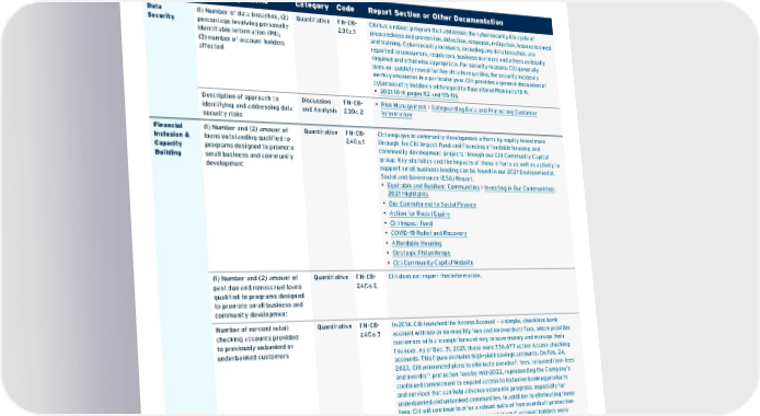 Sustainability Accounting Standards Board Index This index was prepared in accordance with Industry Standards Version 2018-10 issued by the Sustainability Accounting Standards Board (SASB). The disclosures below relate to three sector standards aligned to our mix of businesses: Commercial Banks, Consumer Finance and Investment Banking & Brokerage. Unless otherwise noted, data and descriptions apply to our entire company, not just the businesses relevant to that sector. We do not yet disclose all metrics included in the sector standards, but we will continue to evaluate their relevance to our business and our ability to improve, and we will consider increasing the number of metrics we include in the future. All data is as of and for the year ended Dec. 31, 2021, unless otherwise noted. COMMERCIAL BANKS Topic Accounting Metric Category Code Report Section or Other Documentation Data Security (1) Number of data breaches, (2) percentage involving personally identifiable information (PII), (3) number of account holders affected Quantitative FN-CB- 230a.1 Citi has a robust program that addresses the cybersecurity life cycle of preparedness and prevention, detection, response, mitigation, lessons learned and training. Cybersecurity incidents, including any data breaches, are reported to consumers, regulators, business partners and others as legally required and otherwise appropriate. For security reasons, Citi generally does not publicly reveal further details regarding the security incidents we may encounter in a particular year. Citi provides a general discussion of cybersecurity incidents with regard to Operational Risk in its 10-K. • 2021 10-K pages 52 and 115-116 Description of approach to identifying and addressing data security risks Discussion and Analysis FN-CB- 230a.2 • Risk Management > Safeguarding Data and Protecting Customer Information Financial Inclusion & Capacity Building (1) Number and (2) amount of loans outstanding qualified to programs designed to promote small business and community development Quantitative FN-CB- 240a.1 Citi engages in community development efforts by equity investment through the Citi Impact Fund and financing affordable housing and community development projects through our Citi Community Capital group. Key statistics and the impacts of these efforts as well as activity to support small business lending can be found in our 2021 Environmental, Social and Governance (ESG) Report. • Equitable and Resilient Communities > Investing in Our Communities: 2021 Highlights • Our Commitment to Social Finance • Action for Racial Equity • Citi Impact Fund • COVID-19 Relief and Recovery • Affordable Housing • Strategic Philanthropy • Citi Community Capital Website (1) Number and (2) amount of past due and nonaccrual loans qualified to programs designed to promote small business and community development Quantitative FN-CB- 240a.2 Citi does not report this information. Number of no-cost retail checking accounts provided to previously unbanked or underbanked customers Quantitative FN-CB- 240a.3 In 2014, Citi launched the Access Account — a simple, checkless bank account with low or no monthly fees and no overdraft fees, which provides customers with a straightforward way to save money and manage their finances. As of Dec. 31, 2021, there were 336,677 active Access checking accounts. This figure excludes high-yield savings accounts. On Feb. 24, 2022, Citi announced plans to eliminate overdraft fees, returned item fees and overdraft protection fees by mid-2022, representing the Company’s continued commitment to expand access to inclusive banking products and services that can help advance economic progress, especially for underbanked and unbanked communities. In addition to eliminating these fees, Citi will continue to offer a robust suite of free overdraft protection services for its consumers. Citi does not track if account holders were formerly unbanked/ underbanked. • Risk Management > Eliminating Overdraft Fees for Our Customers’ Financial Wellness • Access Account webpage • Citi Retail Banking Overdraft Fees Change Number of participants in financial literacy initiatives for unbanked, underbanked, or underserved customers Quantitative FN-CB- 240a.4 Our efforts to support underbanked individuals and small businesses are discussed in our 2021 ESG Report. • Our Commitment to Social Finance Contents ESGatCiti SustainableFinance SustainableProgress Equitable&ResilientCommunities Talent&DEI RiskManagement&ResponsibleBusiness Appendices ESGS ataC ius niblnG 150