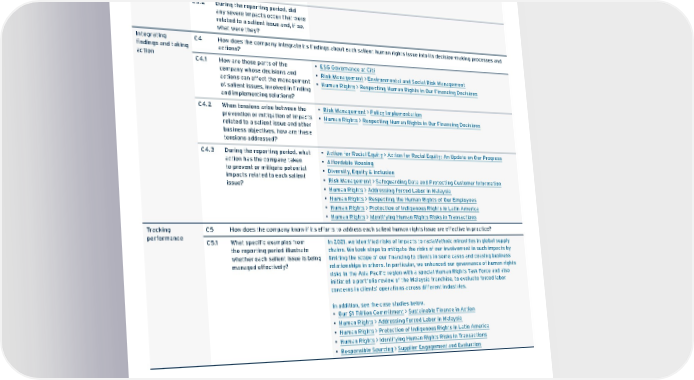 Section of the Framework Report Section or Other Documentation Assessing impacts C3 How does the company identify any changes in the nature of each salient human rights issue over time? C3.1 During the reporting period, were there any notable trends or patterns in impacts related to a salient issue and, if so, what were they? • Human Rights > Addressing Forced Labor in Malaysia • Human Rights > Identifying Human Rights Risks in Transactions C3.2 During the reporting period, did any severe impacts occur that were related to a salient issue and, if so, what were they? Integrating findings and taking action C4 How does the company integrate its findings about each salient human rights issue into its decision-making processes and actions? C4.1 How are those parts of the company whose decisions and actions can affect the management of salient issues, involved in finding and implementing solutions? • ESG Governance at Citi • Risk Management > Environmental and Social Risk Management • Human Rights > Respecting Human Rights in Our Financing Decisions C4.2 When tensions arise between the prevention or mitigation of impacts related to a salient issue and other business objectives, how are these tensions addressed? • Risk Management > Policy Implementation • Human Rights > Respecting Human Rights in Our Financing Decisions C4.3 During the reporting period, what action has the company taken to prevent or mitigate potential impacts related to each salient issue? • Action for Racial Equity > Action for Racial Equity: An Update on Our Progress • Affordable Housing • Diversity, Equity & Inclusion • Risk Management > Safeguarding Data and Protecting Customer Information • Human Rights > Addressing Forced Labor in Malaysia • Human Rights > Respecting the Human Rights of Our Employees • Human Rights > Protection of Indigenous Rights in Latin America • Human Rights > Identifying Human Rights Risks in Transactions Tracking performance C5 How does the company know if its efforts to address each salient human rights issue are effective in practice? C5.1 What specific examples from the reporting period illustrate whether each salient issue is being managed effectively? In 2021, we identified risks of impacts to racial/ethnic minorities in global supply chains. We took steps to mitigate the risks of our involvement in such impacts by limiting the scope of our financing to clients in some cases and ceasing business relationships in others. In particular, we enhanced our governance of human rights risks in the Asia Pacific region with a special Human Rights Task Force and also initiated a portfolio review of the Malaysia franchise, to evaluate forced labor concerns in clients’ operations across different industries. In addition, see the case studies below. • Our $1 Trillion Commitment > Sustainable Finance in Action • Human Rights > Addressing Forced Labor in Malaysia • Human Rights > Protection of Indigenous Rights in Latin America • Human Rights > Identifying Human Rights Risks in Transactions • Responsible Sourcing > Supplier Engagement and Evaluation Contents ESGatCiti SustainableFinance SustainableProgress Equitable&ResilientCommunities Talent&DEI RiskManagement&ResponsibleBusiness Appendices ESGS ataC ius niblnG 174