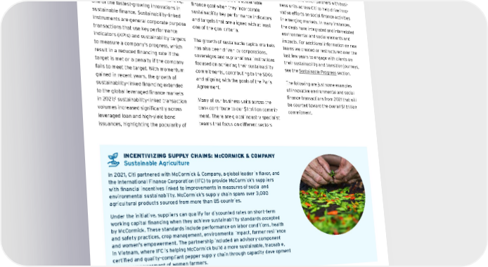 debt issuances in 2020, which itself had set records. 1 The sustainable mergers and acquisitions deal activity reached $197 billion in 2021, which was a 60% increase from 2020 activity. 2 Growth also continues to be seen in the markets for sustainability-linked financing, one of the fastest-growing innovations in sustainable finance. Sustainability-linked instruments a re g eneral c orporate p urpose transactions that use key performance indicators (KPIs) and sustainability targets to measure a company’s progress, which result in a reduced financing rate if the target is met or a penalty if the company fails to meet the target. With momentum gained in recent years, the growth of sustainability-linked financing extended to the global leveraged finance markets in 2021; 2 sustainability-linked transaction volumes increased significantly across leveraged loan and high-yield bond issuances, highlighting the popularity of tying sustainability performance to cost of financing. This innovation is also expected to grow in the derivative markets, with sustainability-linked derivatives. Acknowledging this momentum in the market, we count sustainability-linked instruments toward Citi’s sustainable finance goal when they incorporate sustainability key performance indicators and targets that are aligned with at least one of the goal criteria. The growth of sustainable capital markets has also been driven by corporations, sovereigns and supranational institutions focused on achieving their sustainability commitments, contributing to the SDGs and aligning with the goals of the Paris Agreement. Many of our business units across the bank contribute to our $1 trillion commit - ment. There are global industry specialist teams that focus on different sectors and industries, such as the recently formed Natural Resources & Clean Energy Transition team, which engages with our clients to support their low-carbon transition efforts, as well as the Citi Social Finance team, which partners with busi - ness units across Citi to help drive inno - vative efforts on social finance activities in emerging markets. In many instances, the deals have integrated and interrelated environmental and social elements and impacts. For additional information on new teams we created or restructured over the last few years to engage with clients on their sustainability and transition journeys, see the Sustainable Pr ogress s ection. The following are just some examples of innovative environmental and social finance transactions from 2021 that will be counted toward the overall $1 trillion commitment. INCENTIVIZING SUPPLY CHAINS: M c CORMICK & COMPANY Sustainable Agriculture In 2021, Citi par tnered with McCormick & Company, a global leader in flavor, and the International Finance Corporation (IFC) to provide McCormick’s suppliers with financial incentives linked to improvements in measures of social and environmental sustainability. McCormick’s supply chain spans over 3,000 agricultural products sourced from more than 85 countries. Under the initiative, suppliers can qualify for discounted rates on short-term working capital financing when they achieve sustainability standards accepted by McCormick. These standards include performance on labor conditions, health and safety practices, crop management, environmental impact, farmer resilience and women’s empowerment. The partnership included an advisory component in Vietnam, where IFC is helping McCormick build a more sustainable, traceable, certified and quality-compliant pepper supply chain through capacity development and the empowerment of women farmers. 2. https://www.refinitiv.com/perspectives/market-insights/sustainable-finance-continues-surge-in-2021/ . Contents ESGatCiti SustainableFinance SustainableProgress Equitable&ResilientCommunities Talent&DEI RiskManagement&ResponsibleBusiness Appendices CITI 2021 ESG REPORT 23