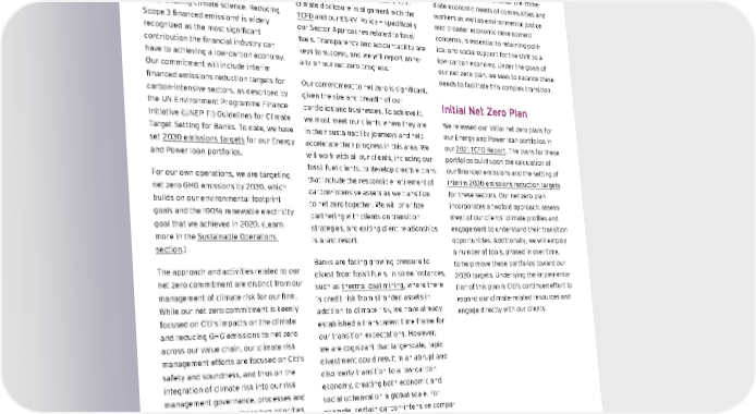 Our Net Zero Commitment In 2 021, w e an nounced ou r c ommitment to n et z ero g reenhouse g as ( GHG) emissions b y 2 050, i n a lignment w ith the o bjectives o f t he P aris A greement and p revailing c limate sc ience. R educing Scope 3 fi nanced e missions 1 is widely recognized a s t he m ost s ignificant contribution t he fi nancial i ndustry c an have t o a chieving a l ow-carbon e conomy. Our c ommitment w ill in clude in terim financed e missions r eduction t argets f or carbon-intensive se ctors, as d escribed b y the U N E nvironment P rogramme F inance Initiative ( UNEP F I) G uidelines f or C limate Target S etting f or B anks. T o d ate, w e h ave set 2030 e missions t argets for our Energy and P ower l oan p ortfolios. For our own operations, we are targeting net zero GHG emissions by 2030, which builds on our environmental footprint goals and the 100% renewable electricity goal that we achieved in 2020. (Learn more in the Sustainable Operations section .) The approach and activities related to our net zero commitment are distinct from our management of climate risk for our firm. While our net zero commitment is keenly focused on Citi’s impacts on the climate and reducing GHG emissions to net zero across our value chain, our climate risk management efforts are focused on Citi’s safety and soundness, and thus on the integration of climate risk into our risk management governance, processes and strategies. Although these two priorities differ in their primary focus, they are related to and reinforce each other, leading to mutual benefits. As we execute on our net zero commitment, the resulting reduction in financed emissions will help to reduce our climate transition risk. Citi’s net zero ambition builds on our commitment to the UNEP FI Principles for Responsible B anking , our leadership in climate disclosure in alignment with the TCFD and our ESRM Policy — specifically our Sector Approaches related to fossil fuels. Transparency and accountability are keys to success, and we will report annu - ally on our net zero progress. Our commitment to net zero is significant, given the size and breadth of our portfolios and businesses. To achieve it, we must meet our clients where they are in their sustainability journeys and help accelerate their progress in this area. We will work with all our clients, including our fossil fuel clients, to develop credible plans that include the responsible retirement of carbon-intensive assets as we transition to net zero together. We will prioritize partnering with clients on transition strategies, and exiting client relationships is a last resort. Banks a re f acing g rowing p ressure t o divest f rom f ossil fu els. I n s ome i nstances, such a s thermal c oal m ining , w here t here is c redit r isk f rom s tranded a ssets i n addition t o c limate r isk, w e h ave a lready established a t ransparent t ime f rame f or our t ransition e xpectations. H owever, we a re c ognizant t hat l arge-scale, r apid divestment c ould r esult i n a n a brupt a nd disorderly t ransition t o a l ow-carbon economy, c reating b oth ec onomic a nd social u pheaval o n a g lobal s cale. F or example, c ertain c arbon-intensive c ompa - nies m ay p lay c ritical r oles i n c hanneling the n ecessary cap ital e xpenditures an d providing t he r aw m aterials t o su pport new c limate t echnologies o r m ay p rovide necessary ba seload p ower f or de veloping countries. An orderly, responsible and equitable transition, which accounts for the imme - diate economic needs of communities and workers as well as environmental justice and broader economic development concerns, is essential to retaining polit - ical and social support for the shift to a low-carbon economy. Under the goals of our net zero plan, we seek to balance these needs to facilitate this complex transition. Initial Net Zero Plan We released our initial net zero plans for our Energy and Power loan portfolios in our 2021 TCFD Report . The plans for these portfolios build upon the calculation of our financed emissions and the setting of interim 2030 emissions reduction targets for these sectors. Our net zero plan incorporates a twofold approach: assess - ment of our clients’ climate profiles and engagement to understand their transition opportunities. Additionally, we will employ a number of tools, phased in over time, to help move these portfolios toward our 2030 targets. Underlying the implementa - tion of this plan is Citi’s continued effort to expand our climate-related resources and engage directly with our clients. 1. Financed emissions are the GHG emissions generated by the operations and entities that financial institutions lend money to or invest in. Contents ESGatCiti SustainableFinance SustainableProgress Equitable&ResilientCommunities Talent& DEI RiskManagement&ResponsibleBusiness Appendices CITI 2021 ESG REPORT 38