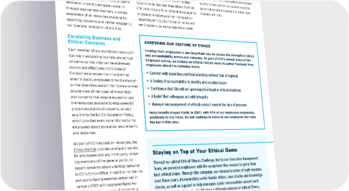 discrimination, harassment and retaliation. Managers are expected to reinforce the importance of following our Leadership Principles, Code of Conduct and Mission and Value Proposition, as well as to encourage employees to speak up and raise any concerns about potential legal or ethical issues. Managers must properly resolve or promptly escalate concerns through appropriate channels, promote awareness of all resources available for reporting concerns and neither engage in, nor tolerate, retaliation of any kind. Escalating Business and Ethical Concerns Each member of our workforce plays a crit - ical role in escalating business and ethical concerns so that they can be addressed quickly a nd e ffectively. C iti’s Co de o f Conduct e mphasizes t he p rinciple t hat, when in doubt, employees should always err on the side of escalation. Our Code provides an overview of the types of misconduct and concerns that require escalation and the resources available to employees for prompt escalation of concerns, as well as a l ink t o t he fu ll C iti E scalation P olicy, which provides even more information for employees a bout e scalation r equirements and r esources. As part of Citi’s escalation resources, the Ethics Hotline p rovides m ultiple c hannels for employees and any third party, includ - ing members of the general public, to report c oncerns a bout u nethical b ehavior to Citi’s Ethics Office. In addition to internal and public-facing websites (enhanced in January 2022 with upgraded features) that f acilitate su bmission o f c oncerns, a telephone line is available 24 hours a day, seven days a week, with live operators who can connect to translators in multiple languages. We believe it is essential that individuals feel secure when raising a concern. All contacts to the Ethics Office and Ethics Office i nvestigations a re t reated a s confidentially a s p ossible, c onsistent w ith the need to investigate and address the matter, a nd su bject t o a pplicable l aws a nd regulations. Concerns may be raised either anonymously o r w ith a ttribution, su bject to applicable laws and regulations. Further, Citi prohibits any form of retaliation against anyone w ho r aises a c oncern or q uestion regarding e thics, d iscrimination o r h arass - ment m atters, as w ell as a gainst a nyone who p articipates i n a su bsequent i nvestiga - tion. Employees who engage in retaliation against a c olleague b ecause t hey r aised a concern or q uestion, a sked f or a r easonable accommodation, r eported a v iolation or was i nvolved i n a n i nvestigation a re su bject to disciplinary action, up to and including termination of employment or other rela - tionship with Citi. ASSESSING OUR CULTURE OF ETHICS Hearing from employees is one important way we assess the strength of ethics and accountability across our company. As part of Citi’s annual Voice of the Employee survey, we include an Ethical Culture Index to gather feedback from employees about the following items: • Comfort with reporting unethical practices without fear of reprisal • A feeling of accountability to identify and escalate issues • Confidence that Citi will act upon reported legal or ethical violations • A belief that colleagues act with integrity • Manager encouragement of ethical conduct even in the face of pressure In dex results stayed stable in 2021, with 91% of our employees responding positively to the index. We will continue to listen to our employees and raise the bar in this area. Staying on Top of Your Ethical Game Through our global Ethical Fitness Challenge, led by our Executive Management Team, we provided employees with the equipment they needed to get in their best ethical shape. Through this campaign, we released a series of eight modules over three years, incorporating senior leader videos, case studies and knowledge checks, as well as support to help managers guide conversations around each topic. Each part in the series highlighted a different element of ethical fitness, such as behavior rationalization, the importance of speaking up, misplaced loyalty and finding clarity in ethical situations. This campaign concluded in 2021, with a required training for all employees to consolidate and reinforce key themes presented over the course of the campaign. Contents ESGatCiti SustainableFinance SustainableProgress Equitable&ResilientCommunities Talent&DEI RiskManagement&ResponsibleBusiness Appendices CITI 2021 ESG REPORT 108