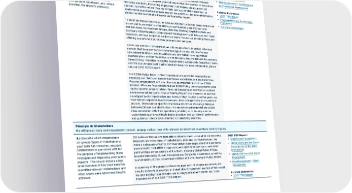 Reporting and Self- Assessment Requirements High-Level Summary of Bank’s Response References 3.2 Describe how your bank has worked with and/or is planning to work with its clients and customers to encourage sustainable practices and enable sustainable economic activities. This should include information on actions planned/implemented, products and services developed, and, where possible, the impacts achieved. Through our $1 trillion commitment to sustainable finance, we will finance and facilitate a wide array of climate solutions, such as renewable energy, clean technology, water conservation and sustainable transportation as well as activities in social finance, which include investments in education, affordable housing and basic infrastructure, healthcare, economic inclusion and food security. Reaching the goal will require the development of innovative financing solutions, increasing engagement and helping clients across all sectors, no matter where they are in their own sustainability journeys, to enable more sustainable business models and practices. For more information, please see the Sustainable Finance section in this report. To facilitate these transitions, we have established dedicated teams embedded across our businesses to offer strategic sustainability and ESG services and solutions. Our business groups, including Banking, Capital Markets and Advisory; Global Markets; Global Wealth Management; and Treasury and Trade Solutions, all have dedicated bankers or teams focused on advising clients and offering customized ESG-themed products and services. Under our net zero commitment, we will engage clients in carbon-intensive sectors that have low-carbon transition opportunities. We have formed specialized business units to work closely with clients to support their business plans as they transition to net zero including the Natural Resources & Clean Energy Transition team; the Sustainability & Corporate Transitions team; and the Sustainable Debt Capital Markets team. For more information, please see our 2021 TCFD Report. Our ESRM Policy helps us finance projects and activities responsibly by engaging our clients on environmental and social risks and good practices. Ongoing engagement with our clients is an important part of our ESRM process. When we first established our ESRM Policy, our engagements were tied to specific, project-related financial transactions and their associated environmental and social risks and mitigation efforts. However, as we have developed Sector Approaches and Areas of High Caution over the years, we have added corporate-level reviews and client engagements in a number of sectors. These sector-specific risk review processes encourage dialogue between Citi and our clients about the material environmental and social risks associated with their operations, enabling us to develop a better understanding of prevailing industry practices and our clients’ performance and guide our clients toward better sustainability practices. 2021 ESG Report: • Sustainable Finance • Climate Risk and Net Zero • Risk Management > Environmental and Social Risk Management External References: • 2021 TCFD Report • Environmental and Social Policy Framework • Net Zero Commitment Principle 4: Stakeholders We will proactively and responsibly consult, engage and partner with relevant stakeholders to achieve society’s goals. 4.1 Describe which stakeholders (or groups/types of stakeholders) your bank has consulted, engaged, collaborated or partnered with for the purpose of implementing these Principles and improving your bank’s impacts. This should include a high- level overview of how your bank has identified relevant stakeholders and what issues were addressed/results achieved. Citi believes that we are best able to drive business value when we serve the interests of a wide array of stakeholders, including our shareholders. We made a deliberate effort to continue stakeholder engagement in a pandemic environment. To fulfill this approach, we regularly review our stakeholder partnerships across a range of functions, including Global Public Affairs, Investor Relations, Human Resources and Corporate Governance, as well as Sustainability & ESG, Government Affairs and other teams in Public Affairs. A summary of the groups we have engaged with, the topics addressed, and results achieved is provided in Stakeholder Engagement section of this report. We also highlight our climate-related engagement with clients and trade associations in our 2021 TCFD Report. 2021 ESG Report: • Stakeholder Engagement • Climate Risk and Net Zero > Participation in Net Zero Frameworks • Climate Risk and Net Zero > Engagement • Risk Management > Client Engagement External References: • 2021 TCFD Report Contents ESGatCiti SustainableFinance SustainableProgress Equitable&ResilientCommunities Talent&DEI RiskManagement&ResponsibleBusiness Appendices ESGS ataC ius niblnG 163