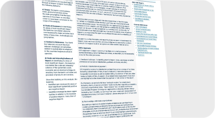 Reporting and Self- Assessment Requirements High-Level Summary of Bank’s Response References Principle 2: Impact and Target Setting We will continuously increase our positive impacts while reducing the negative impacts on, and managing the risks to, people and environment resulting from our activities, products and services. To this end, we will set and publish targets where we can have the most significant impacts. 2.1 Impact Analysis: Show that your bank has identified the areas in which it has its most significant (potential) positive and negative impact through an impact analysis that fulfills the following elements: a) Scope: The bank’s core business areas, products/services across the main geographies that the bank operates in have been as described under 1.1. have been considered in the scope of the analysis. b) Scale of Exposure: In identifying its areas of most significant impact the bank has considered where its core business/its major activities lie in terms of industries, technologies and geographies. c) Context & Relevance: Your bank has taken into account the most relevant challenges and priorities related to sustainable development in the countries/regions in which it operates. d) Scale and intensity/salience of impact: In identifying its areas of most significant impact, the bank has considered the scale and intensity/ salience of the (potential) social, economic and environmental impacts resulting from the bank’s activities and provision of products and services. Show that building on this analysis, the bank has • Identified and disclosed its areas of most significant (potential) positive and negative impact • Identified strategic business oppor - tunities in relation to the increase of positive impacts / reduction of negative impacts Introduction Building on our track record of over 20 years of work on climate change, sustainability and ESG issues, Citi’s approach to impact analysis is a process that has developed organically for our priority strategic initiatives. Prior to becoming a signatory to the Principles, we were engaged in this impact assessment process and we continue to learn from it and adapt it to new and emerging best practices. As such, our process involves concurrent workstreams that provide continuous feedback for the monitoring of potential impacts. This integrated process aligns with the directional intent of the Principles to “embed sustainability at the strategic, portfolio, and transactional levels across all business areas.” We recognize that any approach towards impact analysis is never complete, and the guidance developed by the PRB working groups can be used to help complement our existing work. Additionally, for financial institutions that are beginning their work to explore areas of greatest impacts, we regard the Principles as an efficient framework for embarking on this level of analysis. We plan to use the Principles and reporting from our peers to benchmark the impact areas we have identified and ensure that we are addressing society’s needs in the regions in which we operate and the markets that we serve. Citi’s Approach Citi’s approach to impact consists of multiple concurrent processes, summarized below. Note that these processes, as described, do not necessarily occur in the order presented. 1. Feedback Pathways: To identify potential impact areas, we engage a number of internal and external stakeholders, partners and tools, including: a) Periodic stakeholder engagement: Citi reg ularly reviews its stakeholder partnerships across a range of functions including Global Public Affairs; Investor Relations; Human Resources and Corporate Governance as well as Sustainability; Government Affairs and other teams in Public Affairs. Examples of our stakeholder engagements from 2021 are highlighted in the Stakeholder Engagement at Citi section of this report. Furthermore, we periodically have feedback sessions for stakeholders including clients, investors and NGOs facilitated by the nonprofit sustainability advocacy organization Ceres. These sessions focus on areas such as our Sustainable Progress Strategy and approach to addressing climate change including, most recently, our setting of net zero targets and measurement of baseline emissions. For more information, please see pages 26-27 of our 2021 TCFD Report. b) Partnerships with trade organizations: Becoming a signatory t o global industry initiatives and participating in working groups keeps us abreast of emerging issues and best practices for addressing them. Engagements with organizations such as the Equator Principles, Institute of International Finance (IIF), United Nations Environment Programme Finance Initiative (UNEP FI) and GISD highlight potential issues, increasing awareness of our own potential impacts as a global bank. Such involvement also allows for opportunities to support public policy and regulation that encourages sustainable development. c) Third-party ratings: Analyses cond ucted by third-party organizations allow Citi to benchmark our approaches to certain ESG issues against standardized frameworks and methodologies. Such ratings and their accompanying reports identify areas for improvement and provide useful data that can help drive performance. 2021 ESG Report: • Our Material ESG Issues: Citi in a Global Context • Stakeholder Engagement at Citi • Sustainable Finance • Sustainable Progress • Climate Risk and Net Zero • Equitable and Resilient Communities External References: • 2021 TCFD Report • Action for Racial Equity • Banking in Color • Closing the Racial Inequality Gaps • Environmental and Social Policies • Environmental and Social Policy Framework • Net Zero Commitment • Sustainable Progress Strategy • The Devaluation of Assets in Black Neighborhoods • The Racial Wealth Gap • 2021 10-K Contents ESGatCiti SustainableFinance SustainableProgress Equitable&ResilientCommunities Talent&DEI RiskManagement&Responsible