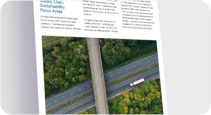 responsibility with our colleagues across the company. Our goal is for all suppliers to complete the CRQ every two years. This helps improve environmental and social practices throughout our supply chain. Supply Chain Sustainability Focus Areas Citi has three sustainability focus areas for our supply chain: paper and paper products, IT hardware and e-waste disposal, and travel and logistics. We have developed actions for each of these areas and incorporated them into our supply chain Global Operating Procedures. As a result of choosing EPEAT-certified options for 99% of our deployed servers, laptops, desktop computers, monitors and mobile phones, we estimate an energy savings of 273 million kilowatt-hours and a greenhouse gas reduction of 57,200 metric tons of CO 2 over the life cycle of the products. In support of responsible forestry, Citi made a commitment in 2020 to use Forest Stewardship Council (FSC) Chain of Custody-certified paper for the outer envelopes used for statements and customer communications. During 2021, we made the transition to and began using FSC-certified paper for outer envelopes. We also began integrating a requirement for FSC-certified bulk roll paper (used for printing statements) into our Request for Proposal (RFP) process. However, we have paused this effort due to global supply chain disruptions that have posed serious challenges to sourcing adequate amounts of FSC-certified paper. We will reassess whether it is possible to move forward with updated RFPs in 2022 and continue to advance our use of digital alternatives. Contents ESGatCiti SustainableFinance SustainableProgress Equitable&ResilientCommunities Talent&DEI RiskManagement&ResponsibleBusiness Appendices CITI 2021 ESG REPORT 137