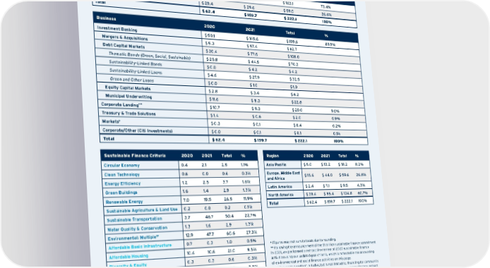 $1 Trillion Sustainable Finance Commitment Financial Data * In billions USD Sustainable Finance 2020** 2021 $ % Environmental Finance $ 33.0 $ 130.1 $ 163.1 73.4% Social Finance $ 29.4 $ 2 9.6 $ 59.0 26.6% Total $ 62.4 $ 159.7 $ 222 .1 100% Sustainable Finance Criteria 2020 2021 Total % Circular Economy 0.4 2.1 2.5 1.1% Clean Technology 0.6 0.0 0.6 0.3% Energy Efficiency 1.2 2.5 3.7 1.6% Green Buildings 1.6 1.4 2.9 1.3% Renewable Energy 7.0 19.5 26.5 11.9% Sustainable Agriculture & Land Use 0.2 0.0 0.2 0.1% Sustainable Transportation 3.7 46.7 50.4 22.7% Water Quality & Conservation 1.3 1.6 2.9 1.3% Environmental: Multiple †† 12.9 47.7 60.6 27.3% Affordable Basic Infrastructure 0.7 0.3 1.0 0.5% Affordable Housing 10.4 10.6 21.0 9.5% Diversity & Equity 0.3 0.3 0.6 0.3% Economic Inclusion 3.9 2.7 6.6 3.0% Education 4.3 0.9 5.3 2.4% Healthcare 4.1 1.9 6.0 2.7% Food Security 0.0 0.0 0.0 0.0% Social: Multiple †† 1.4 4.3 5.7 2.6% Environmental & Social ††† 8.5 17.1 25.6 11.5% Total 62.4 159.7 222.1 100% Region 2020 2021 Total % Asia Pacific $ 5.0 $ 13.2 $ 18.2 8.2% Europe, Middle East and Africa $ 1 5.6 $ 44.0 $ 59.6 26.8% Latin America $ 2.4 $ 7. 1 $ 9.5 4.3% North America $ 39.4 $ 95.4 $ 134.8 60.7% Total $ 62.4 $ 159.7 $ 222 .1 100% Business 2020 2021 Total % Investment Banking $ 50.1 $ 149.6 $ 199.6 89.9% Mergers & Acquisitions $ 5.3 $ 5 7.4 $ 62.7 Debt Capital Markets $ 30.4 $ 77 .6 $ 108.0 Thematic Bonds (Green, Social, Sustainable) $ 25.8 $ 44.5 $ 70.3 Sustainability-Linked Bonds $ 0.0 $ 4.2 $ 4.2 Sustainability-Linked Loans $ 4.6 $ 2 7.9 $ 32.5 Green and Other Loans $ 0.0 $ 1.0 $ 1.0 Equity Capital Markets $ 2.8 $ 3.4 $ 6.2 Municipal Underwriting $ 11.6 $ 11.3 $ 22.8 Corporate Lending *** $ 10.7 $ 9.3 $ 20.0 9.0% Treasury & Trade Solutions $ 1.4 $ 0.6 $ 2.0 0.9% Markets † $ 0.3 $ 0.1 $ 0.4 0.2% Corporate/Other (Citi Investments) $ 0.0 $ 0.1 $ 0.1 0.1% Total $ 62.4 $ 159.7 $ 222 .1 100% * Figures may not sum to totals due to rounding. ** Following the announcement of the $1 trillion sustainable finance commitment in 2021, we performed a retroactive review of 2020 sustainable finance activities using our updated goal criteria, which is reflected in the accounting of environmental and social finance activities on this page. *** “Corporate Lending” includes, but is not limited to, financing for community capital (affordable housing), commercial banking, clean energy finance, project finance, and other lending. † “Markets” currently includes, but is not limited to, commodities transactions that meet renewable energy criteria. † † Denotes activities falling under multiple environmental or social criteria, including green or social bond transactions where the issuer’s framework comprises multiple eligible categories. † † † Refers to transactions that met both environmental and social finance criteria. Credit for such transactions were split evenly between the environmental and social finance goals. Contents ESGatCiti SustainableFinance SustainableProgress Equitable&ResilientCommunities Talent&DEI RiskManagement&ResponsibleBusiness Appendices CITI 2021 ESG REPORT 27