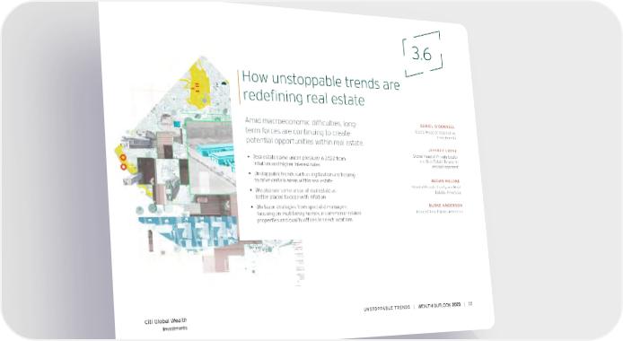 3.6 How unstoppable trends are redefining real estate Amid macroeconomic difficulties, long- DANIEL O’DONNELL term forces are continuing to create Global Head of Alternative Investments potential opportunities within real estate. JEFFREY LOCKE Global Head of Private Equity ƒ Real estate came under pressure in 2022 from and Real Estate Research inflation and higher interest rates and Management ƒ Unstoppable trends such as digitization are helping to drive certain areas within real estate MEGAN MALONE Head of Private Equity and Real ƒ We also see some areas of real estate as Estate, Americas better placed to cope with inflation ƒ We favor strategies from specialist managers BURKE ANDERSON focusing on multifamily homes, e-commerce–related Head of Real Estate, Americas properties and quality offices in select locations Citi Global Wealth UNSToPPABLe TreNDS | | 72 Investments