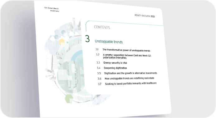 Citi Global Wealth Investments CONTENTS 3 Unstoppable trends 3.1 The transformative power of unstoppable trends 3.2 A greater separation between East and West: G2 polarization intensifies 3.3 Energy security is vital 3.4 Deepening digitization 3.5 Digitization and the growth in alternative investments 3.6 How unstoppable trends are redefining real estate 3.7 Seeking to boost portfolio immunity with healthcare