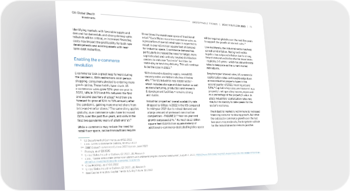 Citi Global Wealth UNSToPPABLe TreNDS | | 75 Investments Identifying markets with favorable supply and three times the warehouse space of traditional will be required globally over the next five years 9 14 demand fundamentals and strong demographic retail. Each 1% increase in e-commerce sales as to support the growth of internet sales. tailwinds will be critical, as increased financing a proportion of overall retail sales is expected to costs may impact the profitability for both new result in over 65 million square feet of demand Like multifamily, the industrial sector has held developments and existing assets with near- for industrial space. E-commerce demand has up well amid inflation. Rent growth within term debt maturities. particularly increased the need for larger, more logistics has outpaced inflation due to strong sophisticated and centrally located distribution tenant demand and to the shorter lease terms centers to enhance “last-mile” facilities for – typically 3-5 years – which has allowed rental Enabling the e-commerce same-day or next-day delivery. This will continue rates to keep pace as the current market 10 rate adjusts. revolution to be the case in 2023. With demand outpacing supply, overall US Despite higher interest rates, US commercial E-commerce took a great leap forward during vacancy rates are historically low at below capitalization rates continued to edge down the pandemic. With restrictions on in-person 4%.11 across industrial property types in the The US industrial real estate sector – shopping, consumers pivoted to ordering more which includes storage and distribution as well second quarter of 2022, hovering around 15 goods online. These habits have stuck: US as manufacturing, production and research 5.1%. Capitalization rates are measured as a e-commerce sales grew 32% year-on-year in & development facilities – remains strong property’s net operating income, expressed 2020, 14% in 2021 and 9% between the first and stable. as a percentage of the property’s value. In and second quarters of 2022.6 2023, industrials’ capitalization rates may And they are forecast to grow at 10% to 15% annually after Industrial properties’ overall availability rate rise, but its stability to date speaks for the the pandemic, gaining more market share from dropped by 60bps in 2022 in the US compared sector’s resilience. 7 to mid-year 2021 due to robust demand and brick-and-mortar stores. The same story applies globally, as e-commerce sales have increased a large amount of preleased construction The industrial market is not immune to increased 12 financing costs nor to slowing growth. But while 133% over the past five years, and 46% in the completions – FIGURE 2. Year-on-year rent first two pandemic years of 2020 and ‘21.8 13 the outsized e-commerce growth over the last growth surpassed 21%. As much as 2.1 billion square feet (0.64 billion square meters) of two years may moderate, the long-term outlook While e-commerce may reduce the need for additional e-commerce-dedicated logistics space for the industrial sector remains positive. retail floor space, online transactions require 6 US Department of Commerce, as of Q2 2022 7 CBRE Global E-commerce Outlook, as of Q2 2022 8,14 CBRE Global E-commerce Outlook 2022 Update, June 2022 9 Prologis, as of Q3 2020 10 United States Industrial Outlook, Q2 2022, JLL Research 11 CBRE, “Global Real Estate Remains an Attractive Investment Despite Economic Headwinds”, August 31, 2022, https://www.cbre.com/insights/viewpoints/global-real-estate-remains-an- attractive-investment-despite-economic-headwinds 12 Crow Holdings, as of Oct 2022 13 United States Industrial Outlook, Q2 2022, JLL Research 15 Real Capital Analytics. Capital Trends: U.S. Big Picture. Q2 2022